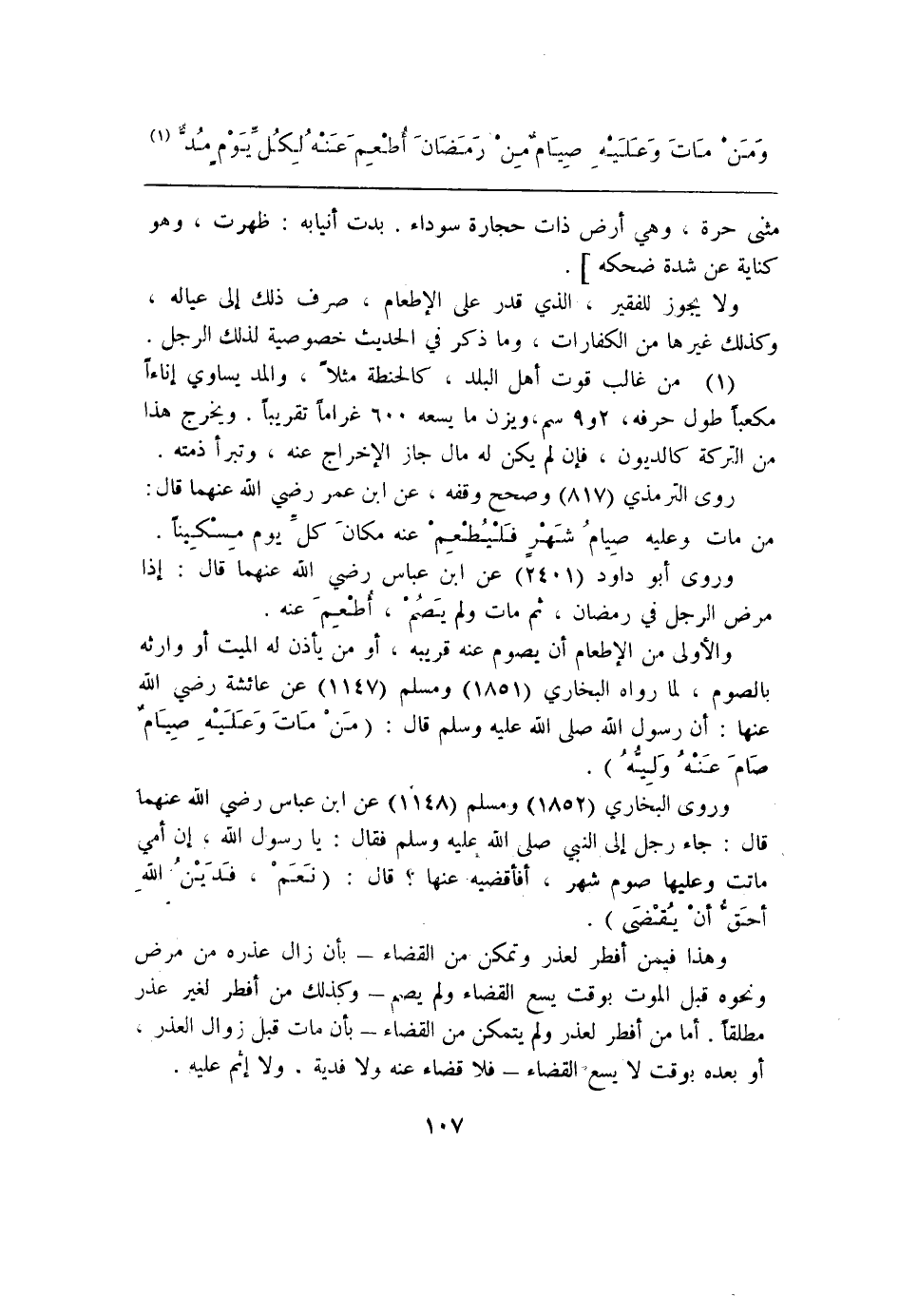 (¬1) من غالب قوت أهل البلد، كالحنطة مثلاً، والمد يساوي إناءاً مكعباً طول حرفه، 2 و 9 سم، ويزن ما يسعه 600 غراماً تقريباً. ويخرج هذا من التركة كالديون، فإن لم يكن له مال جاز الإخراج عنه، وتبرأ ذمته.