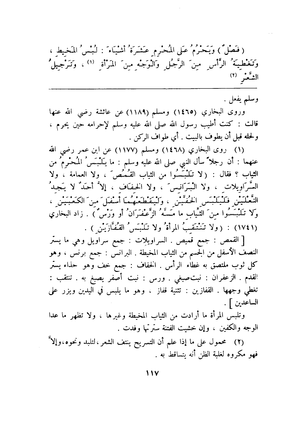 [القمص: جمع قميص. السراويلِات: جمع سراويل وهي ما يستر النصف الأسفل من الجسم من الثياب المخيطة. البرانس: جمع برنس، وهو كل ثوب ملتصق به غطاء الرأس. الخفاف: جمع خف وهو حذاء يستر القدم. الزعفران: نبت صبغي. ورس: نبت أصفر يصبغ به. تنتقب: تغطي وجهها. القفازين: تثنية قفَاز، وهو ما يلبس في اليدين ويزر على الساعدين].