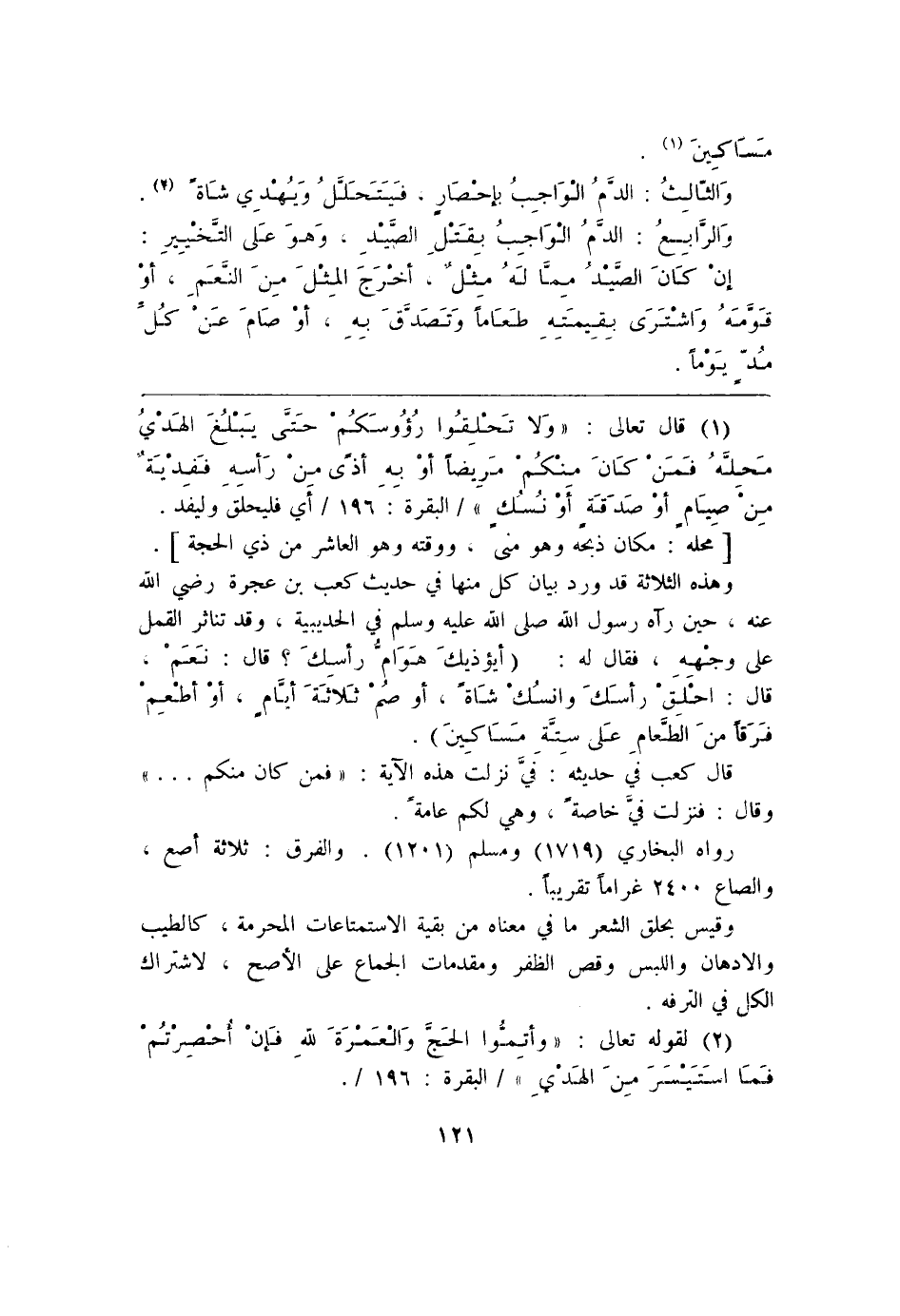 (¬1) قال تعالى: "وَلا تَحْلِقُوا رُؤُوسَكُمْ حَتَى يبْلغُ الهَدْي مَحِلَّهُ فَمَن كَانَ مِنكُمْ مريضاً أوْ به أذى منْ رَأسه فَفدية مِنْ صيَام أو صَدَقَة أو نسَك" / البقرةَ: َ 196/ أَي فليحلَقَ وليفَد.