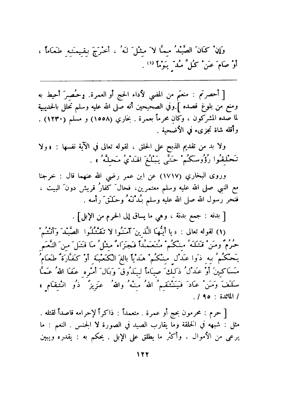 مثل: شبهه في الخلقة وما يقارب الصيد في الصورة لا الجنس. النعم: ما يرعى من الأموال. وأكثر ما يطلق على الإبل. يحكم به: يقدره ويبين