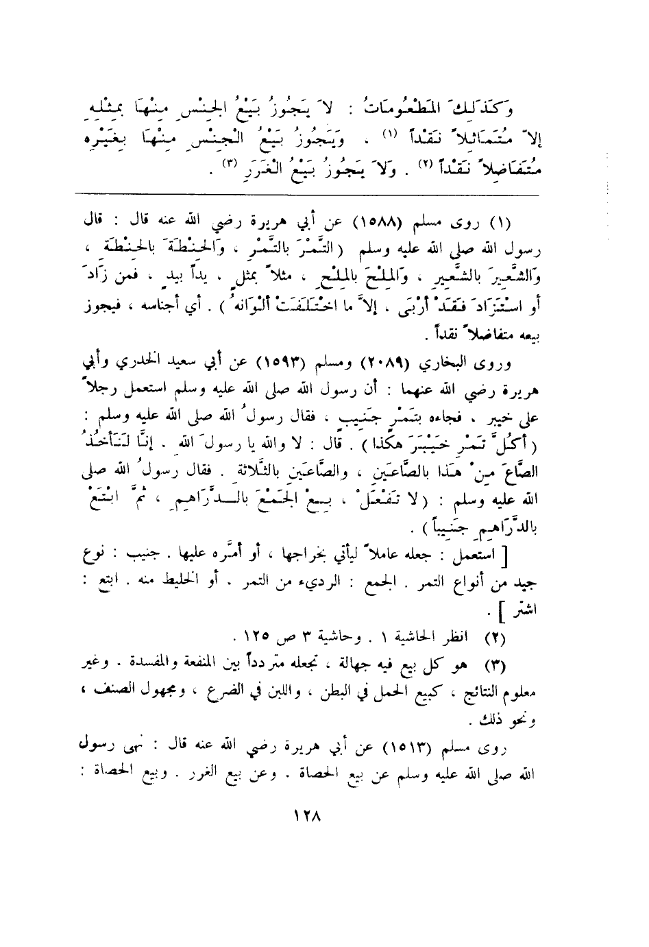(¬1) روى مسلم (1588) عن أبي هريرة رضي الله عنه قال: قال رسول الله صلى الله عليه وسلم (التَّمْرَ بالتمْرِ، والحنْطَةَ بالحِنْطةِ، وَالشَّعير بالشعِيرِ، وَالمِلْحَ بالمِلْحِ، مثلا بمثل، يداً بيد، فمن زَاد أو اسْتزادَ فَقَدْ أرْبَى، إلا ما اختَلَفتْ ألْوَانهُ). أي أجناسه، فيجوز بيعه متفاضلاً نقداً.