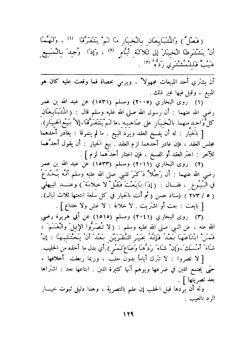 [بالخيًار: له أن يفسخ العقد ويرد البيع. ما لم يتفرقا: يغادر أحَدهما مجلس العقد، فإن غادر أحدهما لزم العقد. بيع الخيار: أن يقول أحدُهما للآخر: اختر العقد أو الفسخ، فإن اختار أحدَهما لزم].