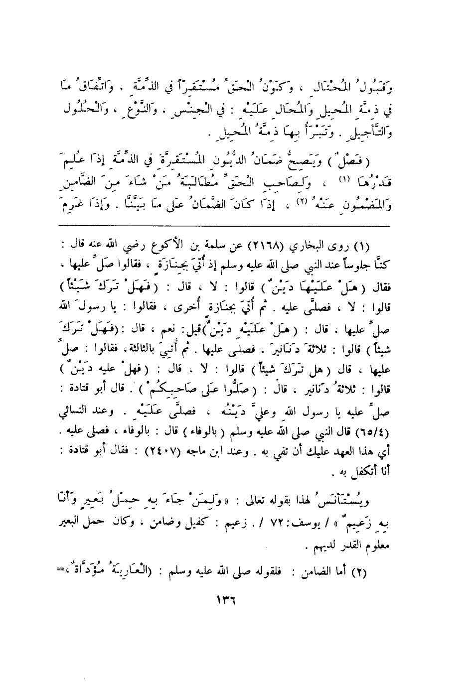 (¬1) روى البخاري (2168) عن سلمة بن الأكوع رضي الله عنه قال: كنا جلوساً عند النبي صلى الله عليه وسلم إذ أتي بجنَازَة، فقالوا صَل عليها فقال (هَلْ عَلَيْهَا ديَنْ) قالوا: لا، قال: (فَهَلْ تَرَك شيئاً) قالوا: لا، فصلَى عليه. ثم أتي بجنَازة أُخرى، فقالوا: يا رسولَ الله صل عليها، قال: (هَلْ عَلَيْه دَيْن) قيل: نعم، قال: (فَهَلْ تَرَكَ شيئاً) قالوا: ثلاثةَ دَنَانير " فصلَى عليها. ثم أتِيَ بالثالثة، فقالوا: صل عليها، قال (هل تَرَكَ شيئاً) قالوا: لا، قال: (فهل عليه دَين) قالوا: ثلاثةُ دَناير، قال: (صَلوا عَلى صَاحِبِكُم). قال أبو قتادة: صل عليه يا رسول الله وعلي دَيْنه، فصلَّى عَلَيْهِ. وعند النسائي (4/ 65) قال النبي صلى الله عليه وسلم (بالوفاء) قال: بالوفاء، فصلى عليه.