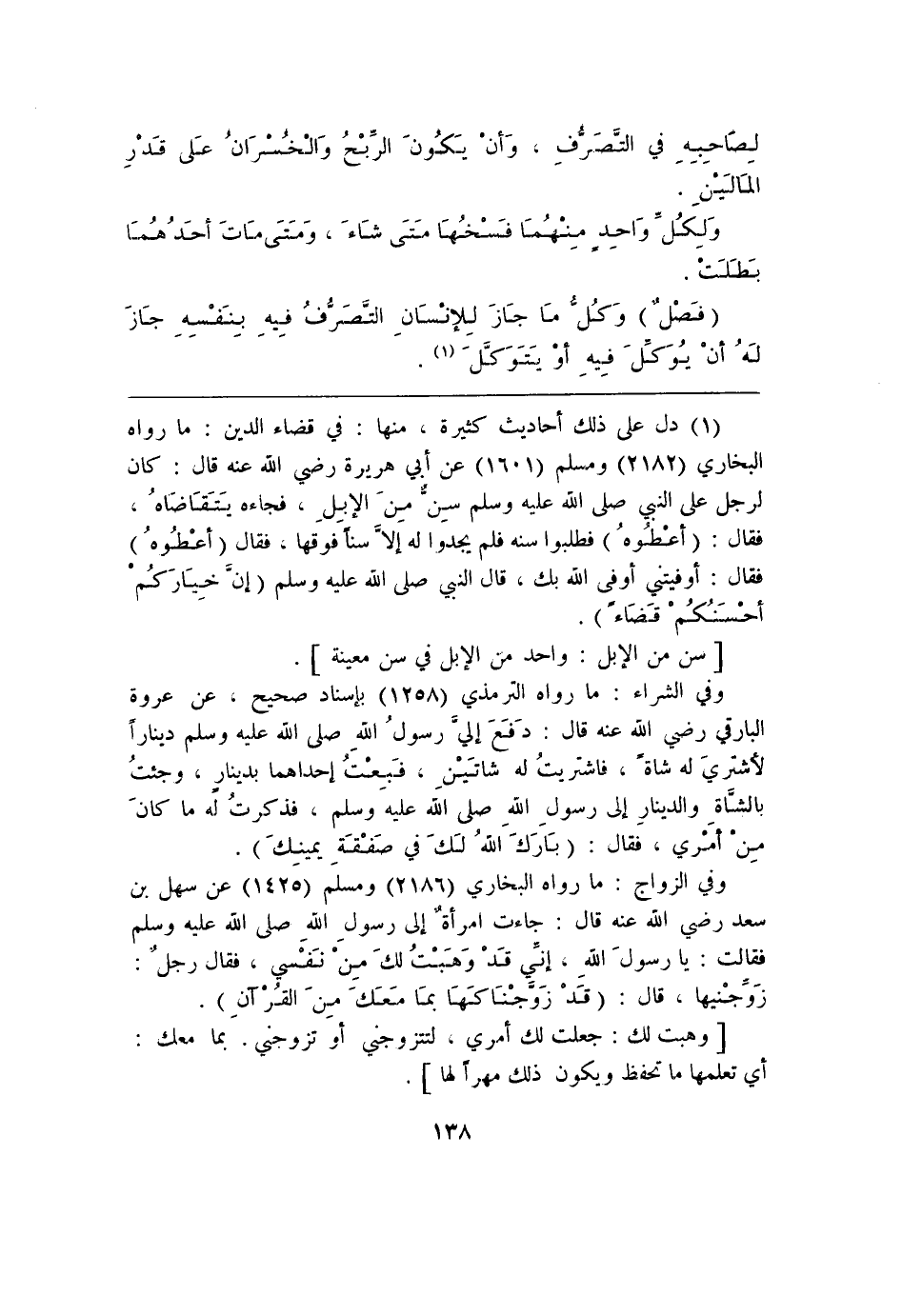 (¬1) دل على ذلك أحاديث كثيرة، منها: في قضاء الدين: ما رواه البخاري (2182) ومسلم (1601) عن أبي هريرة رضي الله عنه قال: كان لرجل على النبي صلى الله عليه وسلم سِن مِنَ الإبِلِ، فجاءه يَتَقَاضاهُ، فقال: (أعْطُوهُ) فطلبوا سنه فلم يجدوا له إلا سناً فوقها، فقال (أعْطُوهُ) فقال: أوفيتني أوفى الله بك، قال النبي صلى الله عليه وسلم (إن خِيَارَكُم أحسَنُكم قَضَاءً).