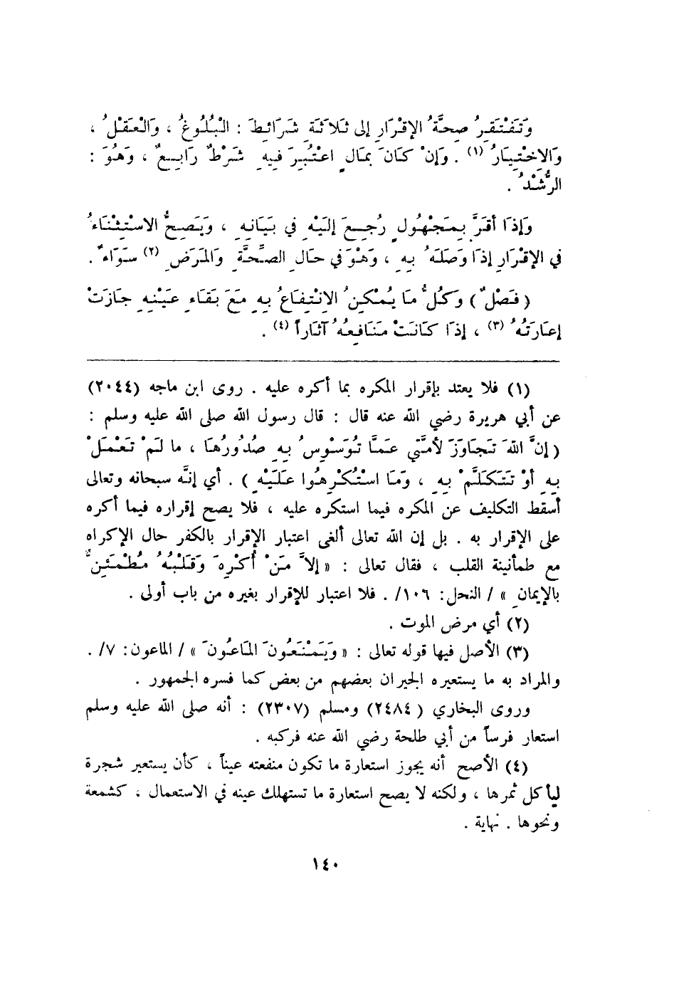 (¬1) فلا يعتد بإقرار المكره بما أكره عليه. روى ابن ماجه (2044) عن أبى هريرة رضي الله عنه قال: قال رسول الله صلى الله عليه وسلم: (إن اللهَ تَجَاوَز لأمتَي عَما تُوَسْوِسُ بِهِ صُدورُها، ما لَمْ تعْمَل به أوْ تتَكَلَّمْ بِهِ، وَمَا استُكرِهُوا عَلَيْه). أي إنه سبحانه وتعالى أسقَط التكليف عن المكره فيما استكره عليه، فَلا يصح إقراره فيما أكره على الإقرار به. بل إن الله تعالى ألغى اعتبار الاقرار بالكفر حال الإكراه مع طمأنينة القلب، فقال تعالى: " إلا مَنْ أكْرِهَ وَقلْبُهُ مطْمَئِن بالإيمان "/ النحل: 106/. فلا اعتبار للإقرار بغيره من باب أولى.