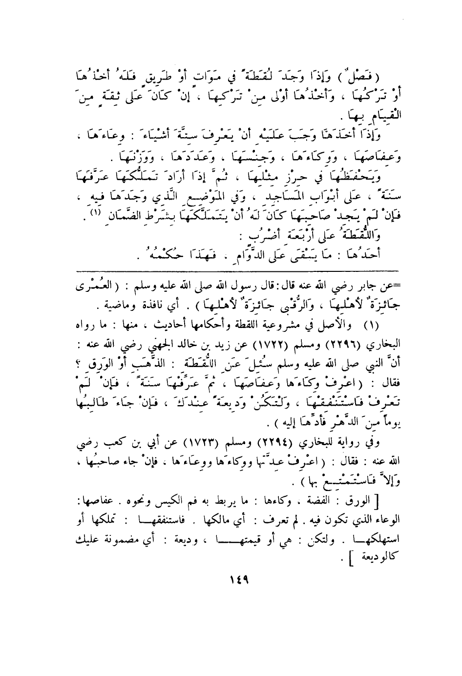 [الورق: الفضة، وكاءها: ما يربط به فم الكيس ونحوه. عفاصها: الوعاء الذي تكون فيه. لم تعرف: أي مالكها. فاستنفقها: تملكها أو استهلكها. ولتكن: هىِ أو قيمتها، وديعة: أي مضمونة عليك كالوديعة].