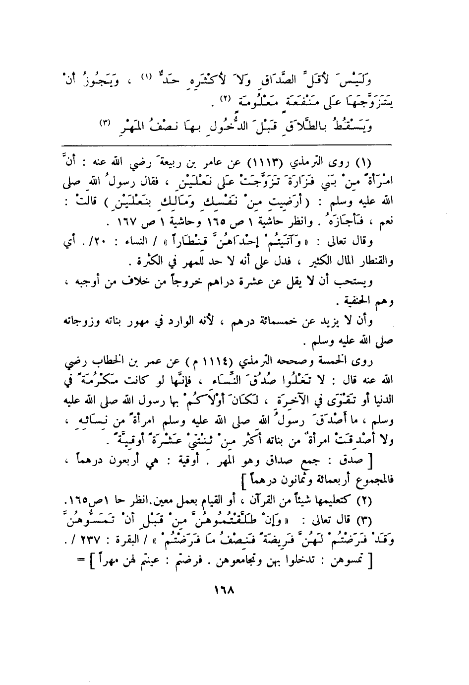 (¬1) روى الترمذي (1113) عن عامر بن ربيعةَ رضي الله عنه: أنً امْرَأة مِن بَني فَزَارَةَ تَزَوَجَتْ عَلى نَعْلَيْنِ، فقال رسولُ الله صلى الله عليه وسلم: (أرَضِيتِ مِنْ نَفسِك وَمَالِكِ بنَعْلَيْنِ) قالَتْ: نعم، فَأجَازَهُ. وانظر حاشية 1 ص 165 وَحاشية 1ص 167.