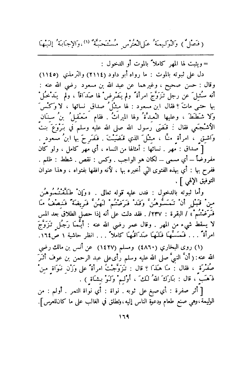 (¬1) روى البخاري (4860) ومسلم (1427) عن أنس بن مالك رضي الله عنه: (أن النبي صلى الله عليه وسلم رأى على عبد الرحمن بن عوف أثر صُفْرَة، فقال: مَا هَذا؟ قال: تَزَوجْت امرأةً على وَزْنِ نَوَاةٍ مِن ذَهَب، قال: بَارَكَ اللهُ لَكَ، أَولِم وَلَوْ بشاة).