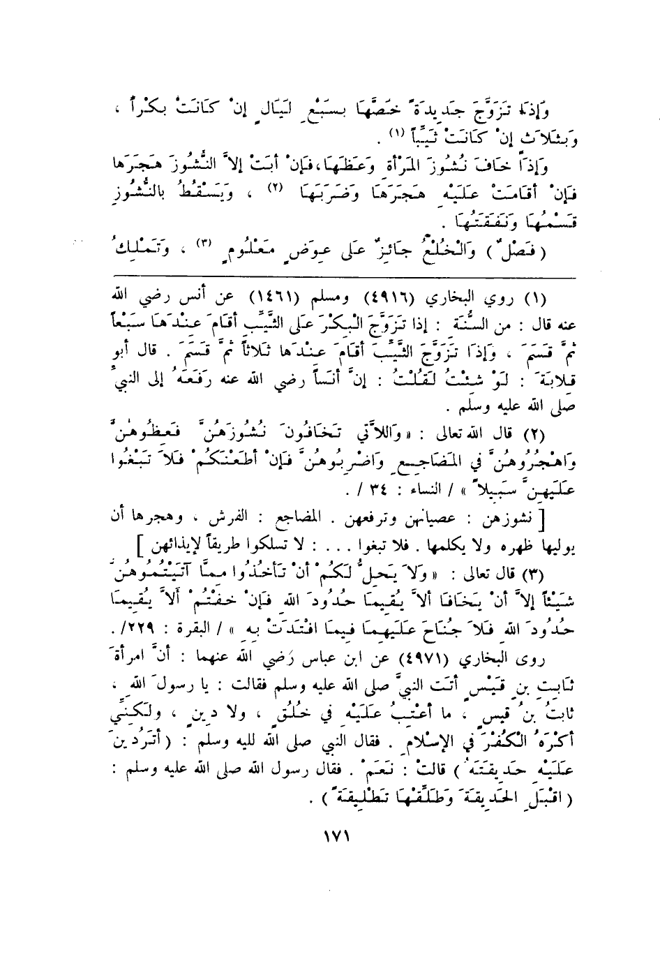 (¬1) روي البخاري (4916) ومسلم (1461) عن أنس رضي الله عنه قال: من السُّنة: إذا تَزَوجَ البكرَ عَلى الثَّيَبِ أقَامَ عِنْدَهَا سَبعاً ثم قَسَمَ، وإذَا تًزَوَجَ الثيبَ أقَامَ عنْدَها ثَلاثاً ثم قَسم. قال أبو قلابَةَ: لَوْ شئت لَقُلْتُ: إن أنَساً رضى الله عنه رَفَعَهُ إلى النبي صَلى الله عليه وسلَم.