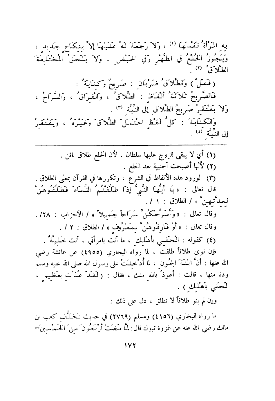 فالصريح ثلاثة ألفاظ الطلاق والفراق والسراح ولا يفتقر صريح الطلاق إلى النية (¬3)