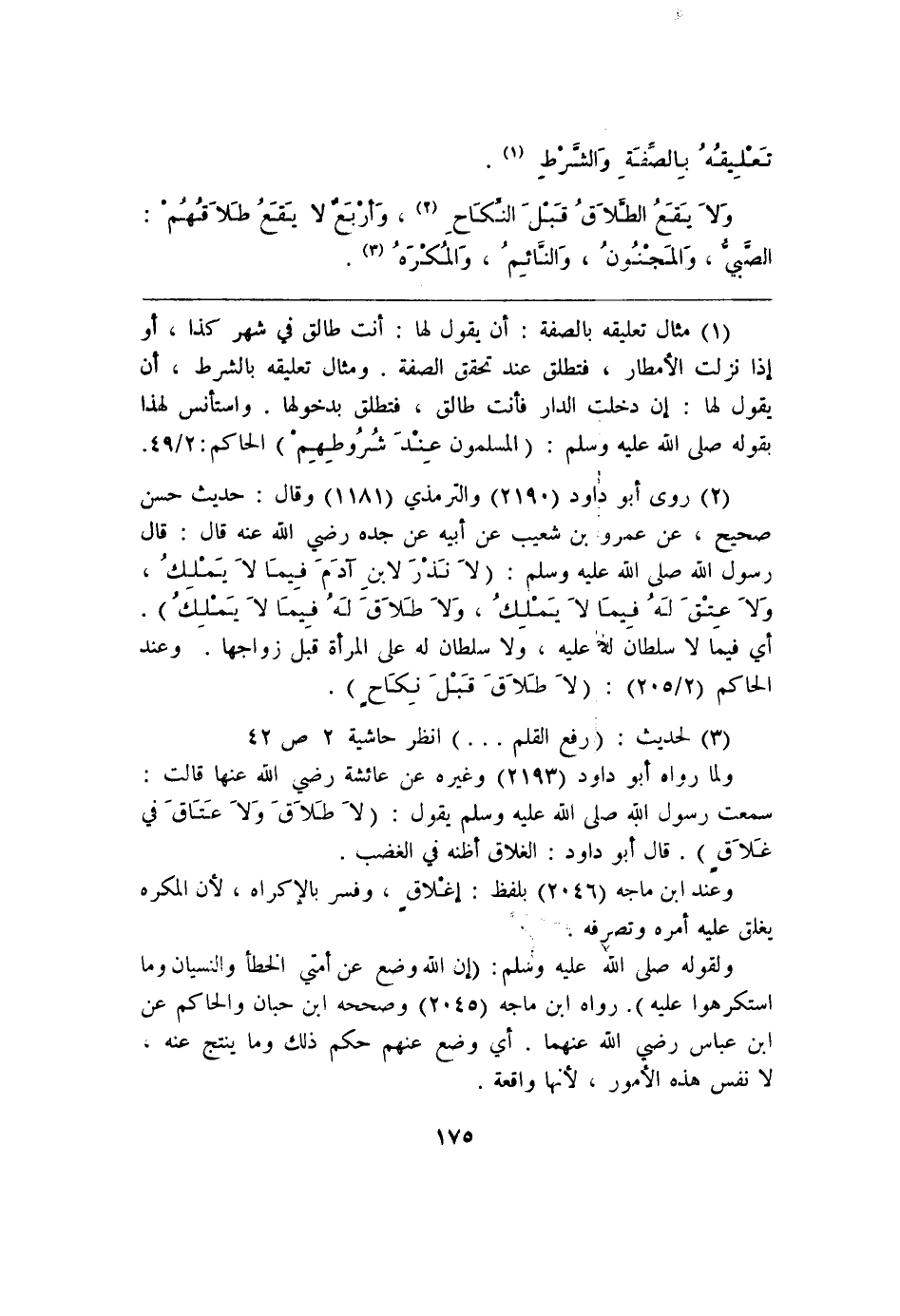 (¬1) مثال تعليقه بالصفة: أن يقول لها: أنت طالق في شهر كذا، أو إذا نزلت الأمطار، فتطلق عند تحقق الصفة. ومثال تعليقه بالشرط، أن يقول لها: إن دخلت الدار فأنت طالق، فتطلق بدخولها. واستأنس لهذا بقوله صلى الله عليه وسلم: (المسلمون عِنْدَ شُرُوطِهِمْ) الحاكم: 2/ 49.