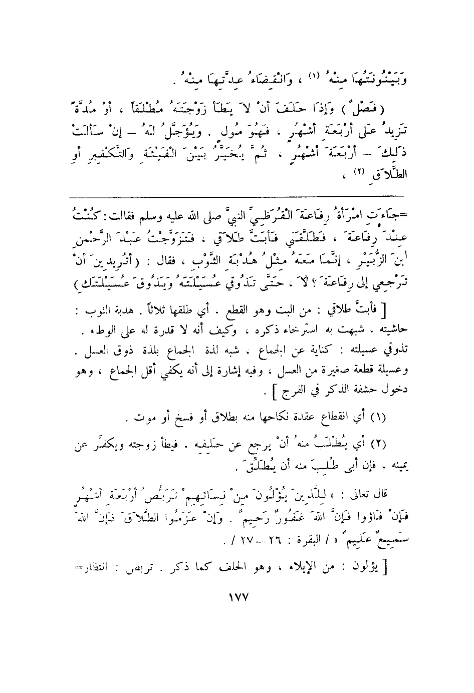 = جاءتِ امْرَأةُ رِفَاعةَ الْقُرَظِي النبي صلى الله عليه وسلم فقالت. كُنْت عنْدَ رفَاعةَ، فَطلَّقني فأبَتَّ طلاًَقي، فَتَزَوَجت عبدَ الرَّحمنِ ابنَ الزبير، إنَّمَا مَعَهُ مِثْلُِ هُدْبَةِ الثوْبِ، فقال: (أتريدِينَ أنْ تَرْجِعي إلى رِفَاعَةَ؟ لَاَ، حَتى تَذُوقي عسَيْلتهُ وَيَذوقَ عسَيْلَتكَِ) [فأبت طلاقي: من البت وهو القطع، أي طلقها ثلاثاً. هدبة الثوب: حاشيته، شبهت به استرخاء ذكره، وكيف أنه لا قدرة له على الوطء.