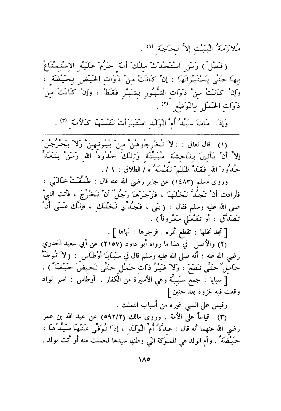 (¬3) قياساً على الأمة. وروى مالك (2/ 592) عن عبد الله بن عمر رضي الله عنهما أنه قال: عدَةُ أم الْوَلَد، إذَا تُوَفَي عَنْهَا سَيدُهَا، حيْضَةٌ. وأم الولد هي المملوكة التي وطئهاَ سيدها فحملت منه أو أتت بولد.