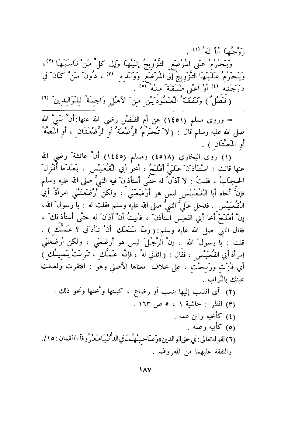 (¬1) روى البخاري (4518) ومسلم (1445) أن عائشةَ رضي الله عنها قالت: اسْتَأذَنَ عَلَي أفْلَحَ، أخو أبي الْقُعَيسِ، بَعْدَ ما أنْزِلَ الحجَابُ، فقلتُ: لا آذَنُ له حتَى أستأذِنَ فيه النبي صلى الله عليه وسلم فإنًّ أخاه أبا الْقعيسِ ليس هو أرْضَعني، لكن أرضَعَتْني امرأةُ أبي القعيسْ ِ. فدخل عَلي النبي صلى الله عليه وسلم فقلت له: يا رسولَ الله، إن أفْلَحَ أخا أبي القعيس استأذنَ، فأبيت أنْ آذَنَ له حتَى أستأذنكَ، فقال النبي صلى الله عليه وسلم: (ومَا مَنَعَك أنْ تأذَني؟ عَمكِ). قلت: يا رسولَ الله، إن الرجلَ ليس هو أرضعني، ولكن أرضْعتنيْ امرأة أبي القُعَيسْ ِ، فقَال: (ائذني لهُ، فإنَّه عَمَّكِ، تَرِبَتْ يَمينُك) أي فزْتِ ورَبْحتِ، على خلاف معناها الأصلي وهو: افتقرت ولصقت يمينك بالتراب.