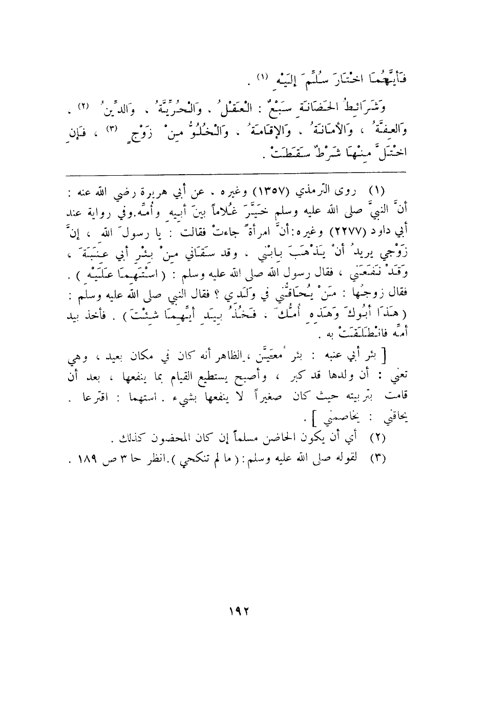 (¬1) روى الترمذي (1357) وغيره، عن أبي هريرة رضي الله عنه: أن النبي صلى الله عليه وسلم خيَرَ غُلِاماً بين أبيهَ وأمِّه. وفي رواية عند أبي داود (2277) وغيره: أن امرأةً جاءتْ فقالت. يا رسولَ الله ِ، إنَّ زَوْجي يريد أنْ يَذْهَبَ بِابني، وقد سَقَاني منْ بئرِْ أبيِ عِنَبةَ، وَقَد نَفعني، فقال رسول الله صلى الله عليه وسلم: (استَهما عَليه).