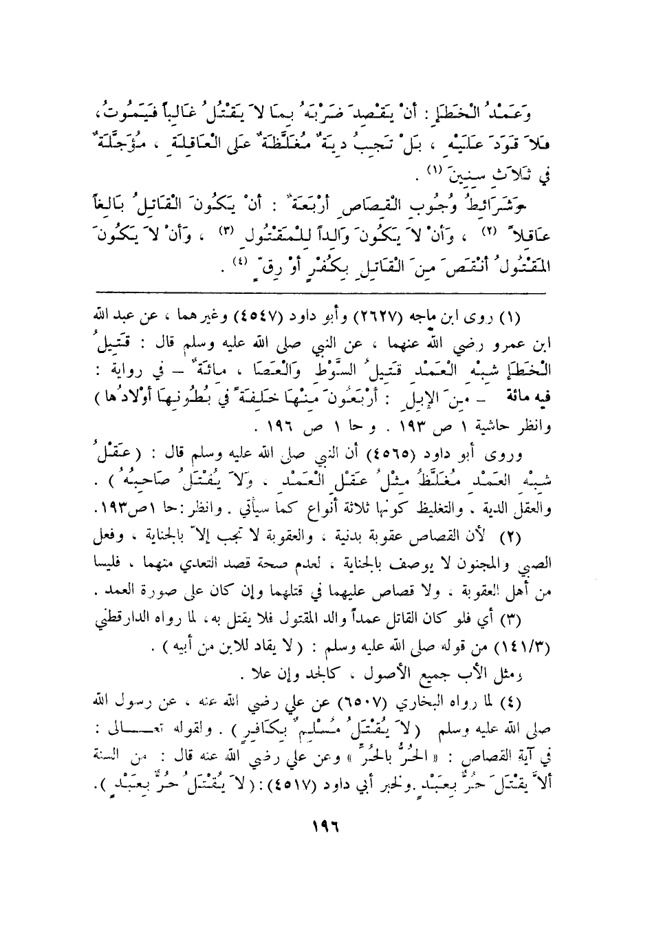 (¬4) لما رواه البخاري (6507) عن علي رضي الله عنه، عن رسول الله صلى الله عليه وسلم (لاَ يقتَلُ مسْلِم بكَافِر). ولقوله تعالى: في آية القصاص: " الحر بالحرِّ " وعن علي رضي الله عنه قال: من السنة ألاً يقتلَ ِحُر بعبد ولخبر أبي داود (4517): (لاَ يقتلٌ حُر بِعبدٍ).