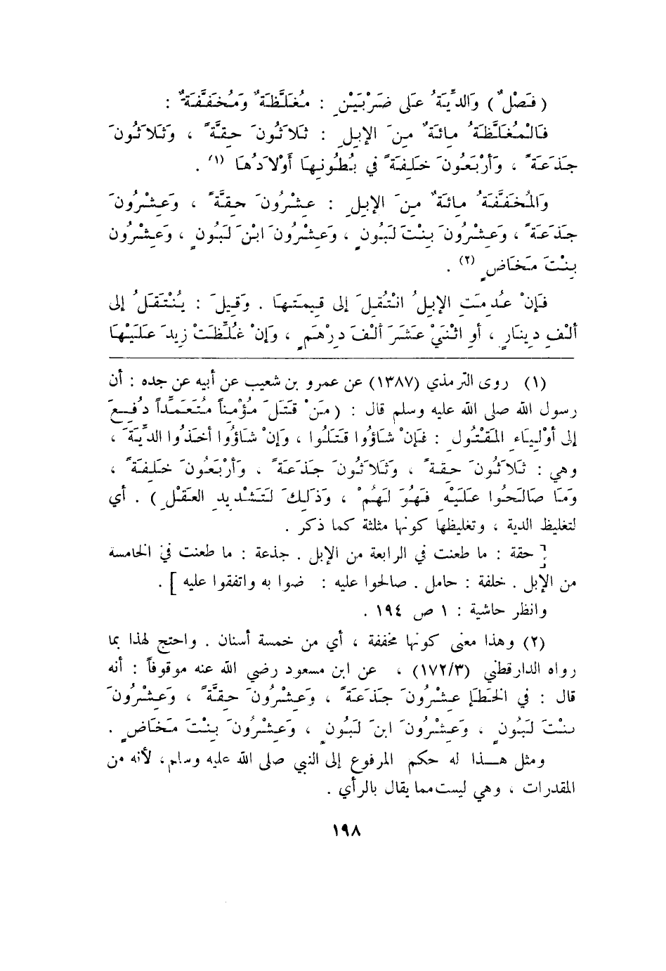 (¬1) روى الترمذي (1387) عن عمرو بن شعيب عن أبيه عن جده: أن رسول الله صلى الله عليه وسلم قال: (منْ قتلَ مؤمناً متَعَمداً دُفِع إلى أولياءِ المَقْتولِ: فإنْ شَاؤُوا قَتلُوا، وَإنْ شاؤوا أخَذُوا الديَةَ، وهي: ثلاَثُونَ حقة، وثَلاَثونَ جَذَعة، وَأرْبَعونَ خَلفَة، وَما صَالَحُوا عَليْهَِ فَهو لهم، وَذَلِكَ لَتَشْديدِ العَقْلِ). أي لتغليظ الدية، وتغليظها كونها مثلثة كما ذكر.