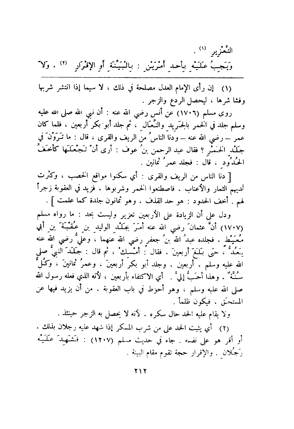 ودل على أن الزيادة على الأربعين تعزير وليست بحد: ما رواه مسلم (1707) أن عثمانَ رضي الله عنه أمرَ بجلد الوليد بن عُقْبَةَ بن أبي مُعَيْطٍ، فجلده عبدُ الله بن عمر رضي الله عَنهما، علي رضي الله عنه يعُد، حتى بَلغَ أربعين، فقال: أمْسكْ، ثم قال: جَلَدَ النبي صلى الله عليه وسلم، أربعين، وجلد أبو بكرَ أربعينَ، وعمرُ ثمانينَ، وكُلٌ سُنَّةٌ، وهذا أحَبّ إلي. أي الاكتفاء بأربعين، لأنه الذي فعله رسول الله صلى الله عليه وسلم، وهو أحوط في باب العقوبة، من أن يزيد فيها عن المستحَق، فيكون ظلماً.