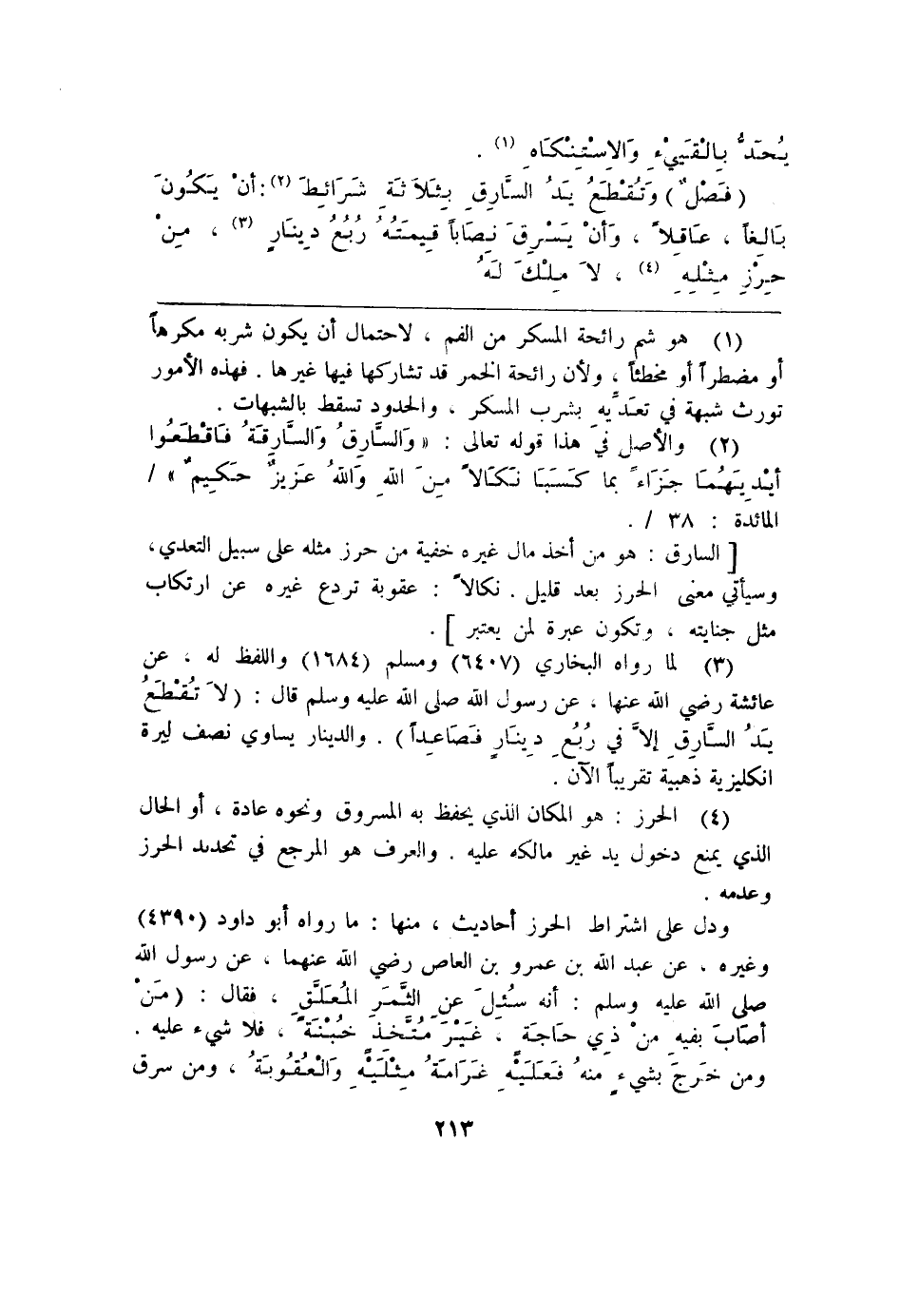 (¬3) لما رواه البخاري (6407) ومسلم (1684) واللفظ له. عن عائشة رضي الله عنها. عن رسول الله صلى الله عليه وسلم قال: (لاَ تُقْطَع يَدُ السَارِقِ إلا في ربعُِ ديِنَار فَصَاعِداً). والدينار يساوي نصف ليرة انكليزية ذهبية تقريباً الآن.