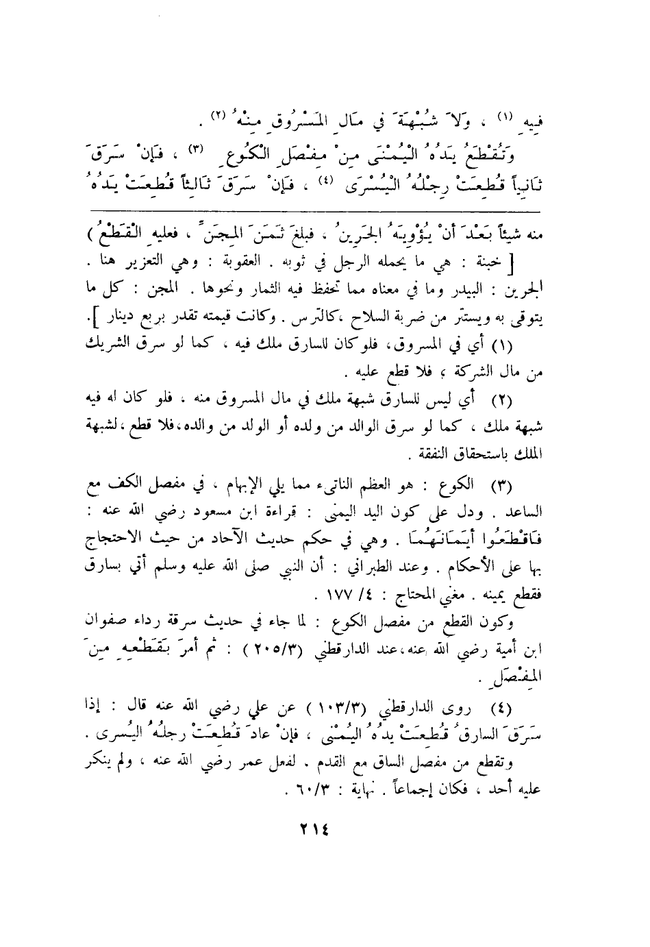 (¬3) الكوع: هو العظم الناتىء مما يلي الإبهام، في مفصل الكف مع الساعد. ودل على كون اليد اليمنى: قراءة ابن مسعود رضي الله عنه: فَاقْطَعُوا أيَمَانَهُمَا. وهي في حكم حديث الآحاد من حيث الاحتجاج بها على الأحكام. عند الطبراني: أن النبي صلى الله عليه وسلم أتي بسارق فقطع يمينه. مغني المحتاج: 4/ 177.