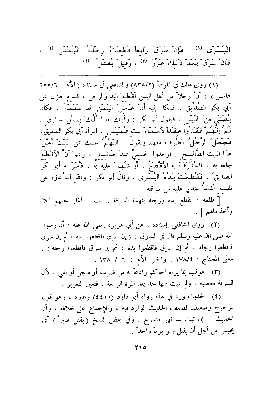 (¬2) روى الشافعي بإسناده، عن أبي هريرة رضي الله عنه: أن رسول الله صلى الله عليه وسلم قال في السارق: (إن سرق فاقطعوا يده، ثم إن سرق فاقطعوا رجله، ثم إن سرق فاقطعوا يده، ثم إن سرق فاقطعوا رجله).
