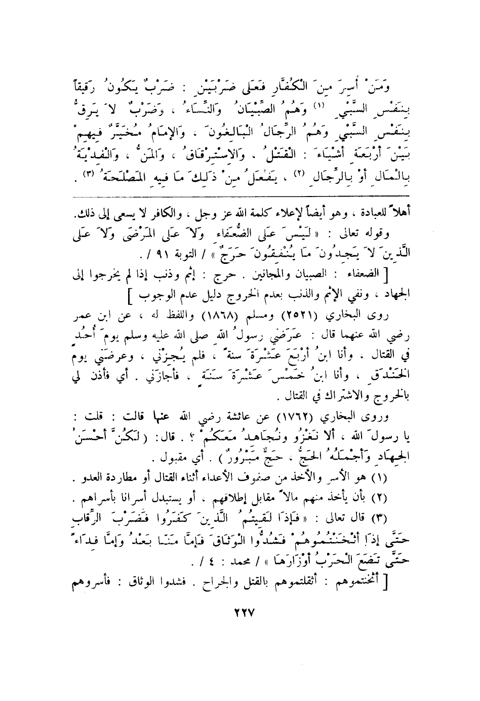 (¬3) قال تعالى: "فَإذَا لقِيتُمُ الَّذِينَ كَفَرُوا فًضرْبَ الرقابِ حَتَى إذَا أثخنتموهُمْ فَشُدُوا الْوَثَاقَ فَإمَّا مَنّا بَعْدُ وَإمَا فِدَاء ً حَتى تَضعً الْحَرْبُ أوْزارَهَا " / محمد: 4/.