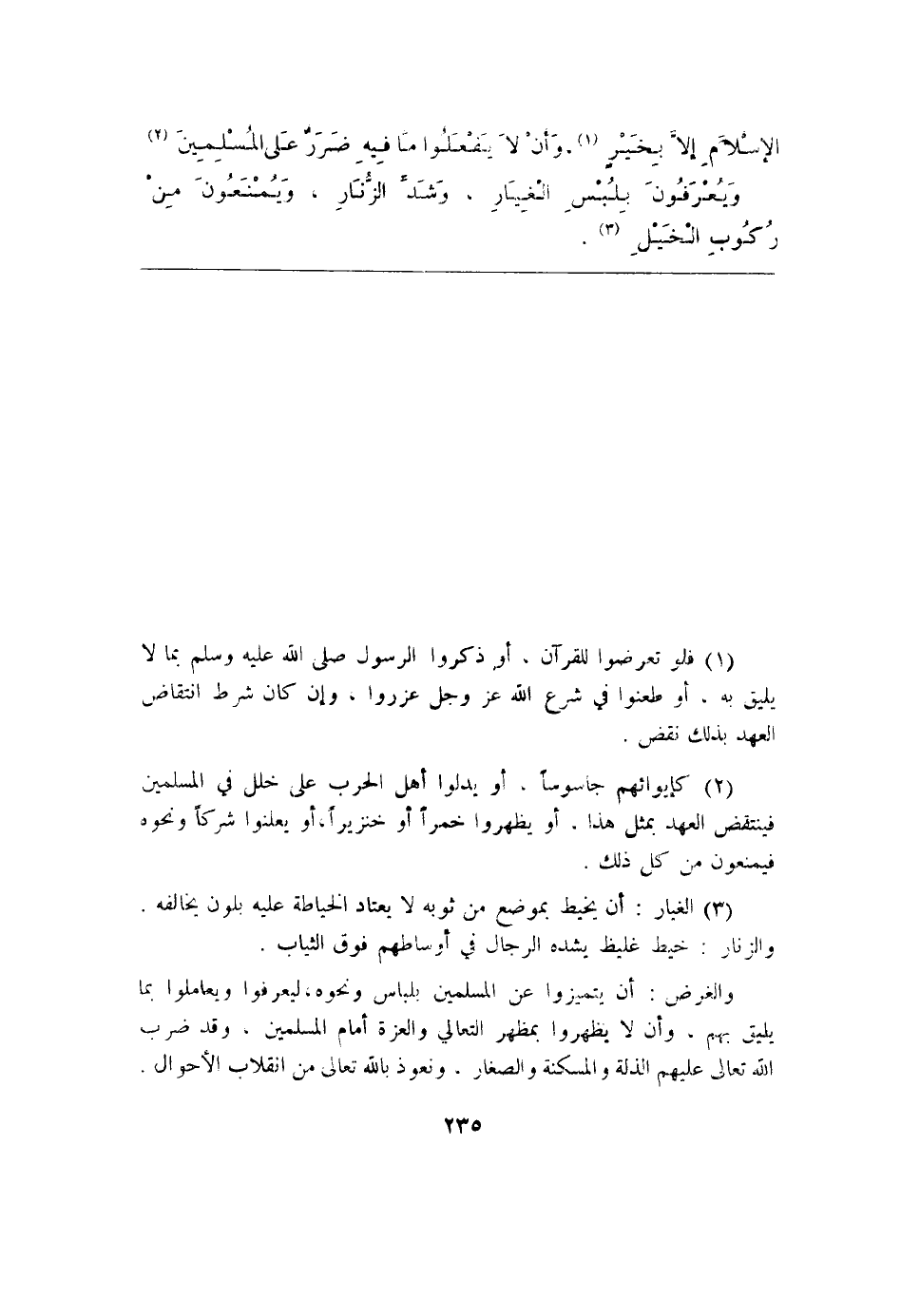 (¬1) فلو تعرضوا للقرَآن، أو ذكروا الرسول صلى الله عليه وسلم بما لا يليق به، أو طعنوا في شرع الله عز وجل عزروا، وإن كان شرط انتقاض العهد بذلك نقض.