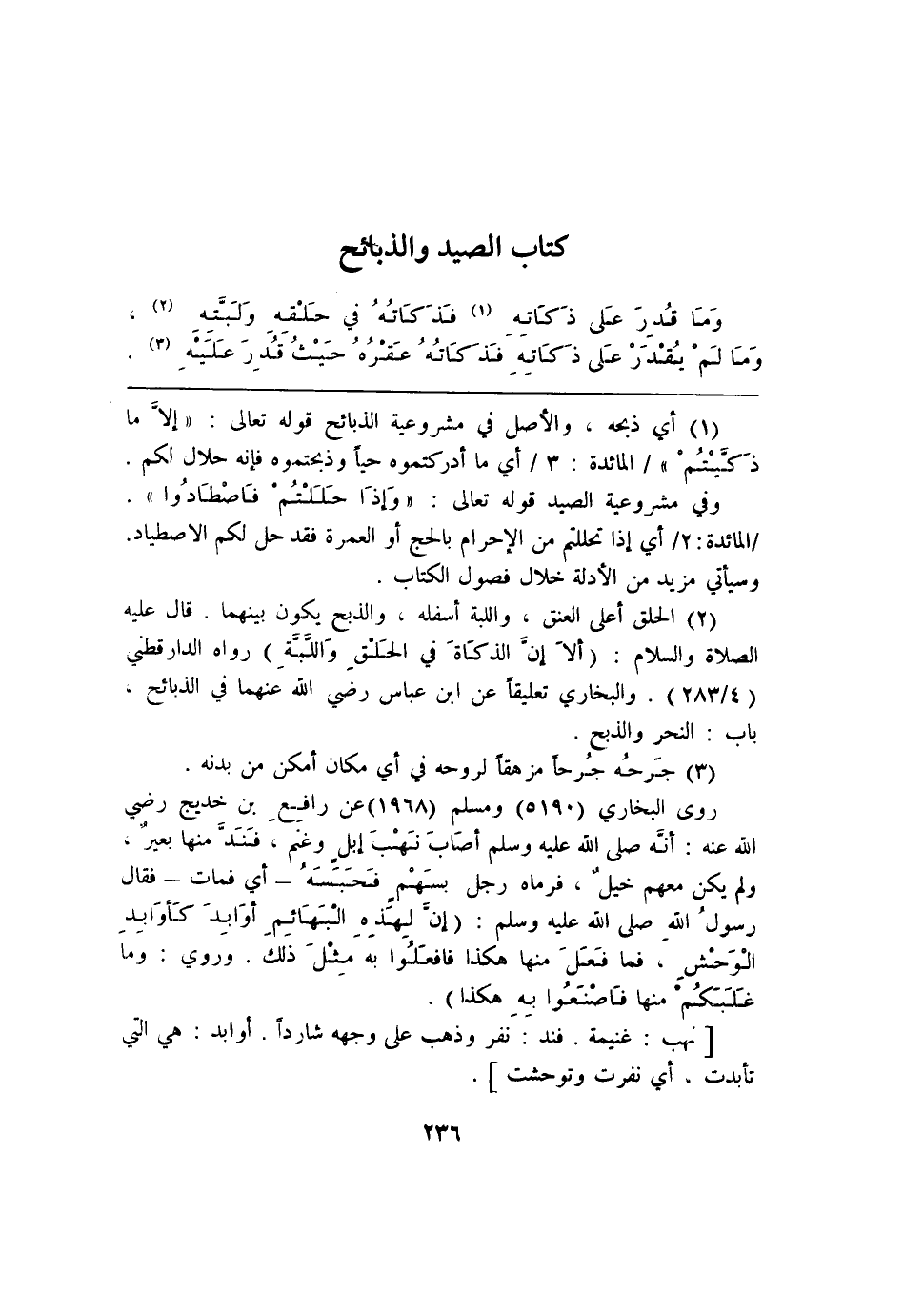 (¬1) أي ذبحه، والأصل في مشروعية الذبائح قوله تعالى: " إلا ما ذَكيتمْ " / المائدة: 3/ أي ما أدركتموه حياً، ذبحتموه فإنه حلال لكم.
