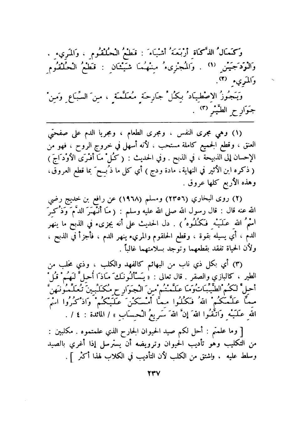 (¬3) أي بكل ذي ناب من البهائم كالفهد والكلب، وذي مخلب من الطير، كالبازي والصقر. قال تعال: " يسَألُونَكَ مَاذَ اأحِلَ لَهمْ قُلْ أحِل لَكُمْ الطيباتُ وَمَا عَلمْتم مِنَ الْجَوَارِحِ مُكَلَبينَ تُعَلَمُونَهن مِمَا عَلَمَكُمْ اللهُ فَكُلُوا مِمّا أمسكنَ عَلَيكُمَْ وَاذْكُرُوا اسمَ اللهِ عَلَيْه وَاتقُوا اللهَ إن الله سَرِيع الْحِسَابِ " / المائدة: 4/.