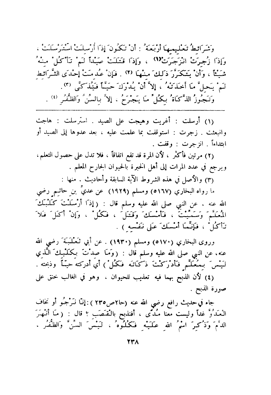 (¬1) أرسلت: أغربت وهيجت على الصيد. استرسلت: هاجت وانبعثت. زجرت: استوقفت بما علمت عليه بعد عدوها إلى الصيد أو ابتداءاً. انزجرت: وقفت.