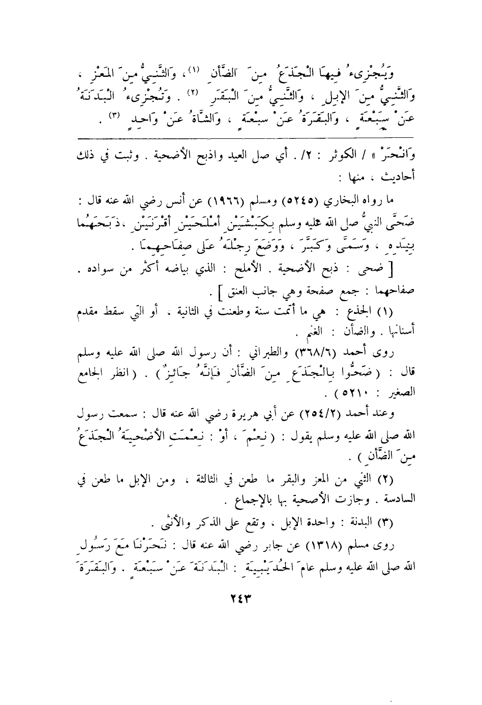 وَانْحرْ " / الكوثر: 2/. أي صل العيد واذبح الأضحية. وثبت في ذلك أحاديث، منها: ما رواه البخاري (5245) ومسلم (1966) عن أنس رضي الله عنه قال: ضحَى النبيُ صلى الله عليه وسلم بِكَبشيْنِ أمْلَحَيْنِ أقرَنينِ، ذَبَحَهما بِيَدِهِ، وَسَمى وَكَبرَ، وَوَضعً رجْلهُ عَلى صِفاحِهِمَا.