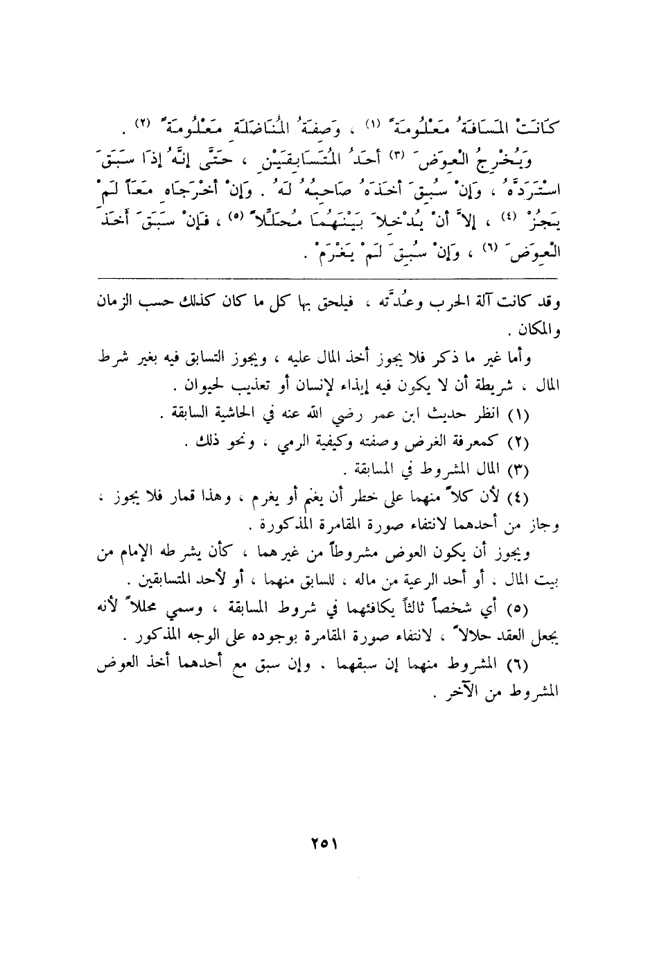 (¬5) أي شخصاً ثالثاً يكافئهما في شروط المسابقة، وسمي محللا لأنه يجعل العقد حلالاً، لانتفاء عورة المقامرة بوجوده على الوجه المذكور.