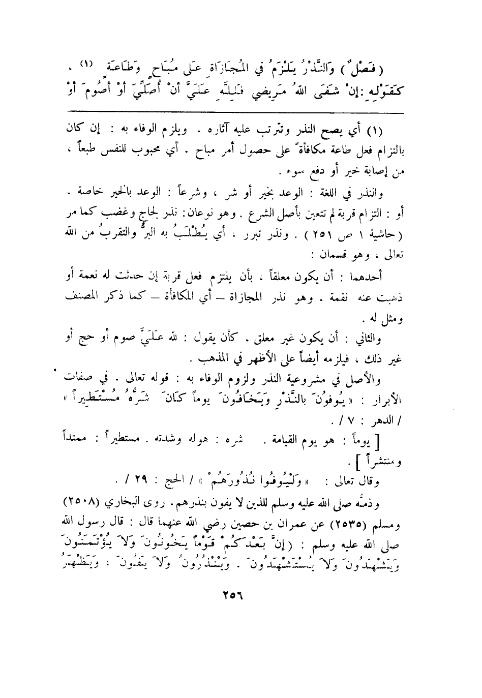 (¬1) أي يصح النذر وترتب عليه آثاره، ويلزم الوفاء به: إن كان بالتزام فعل طاعة مكافأة على حصول أمر مباح، أي محبوب للنفس طبعاً، من إصابة خير أو دفع سوء.