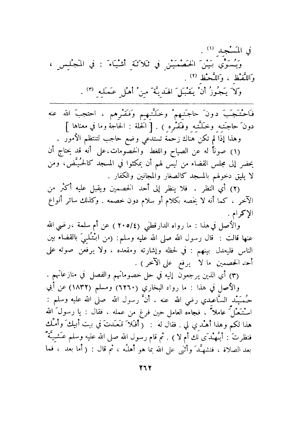(¬1) صوناً له عن الصياح واللغط والخصومات، على أنه قد يحتاج أن يحضر إلى مجلس القضاء من ليس لهم أن يمكثوا فيَ المسجد كالحُيَّض، ومن لا يليق دخولهم بالمسجد كالصغار والمجانين والكفار.
