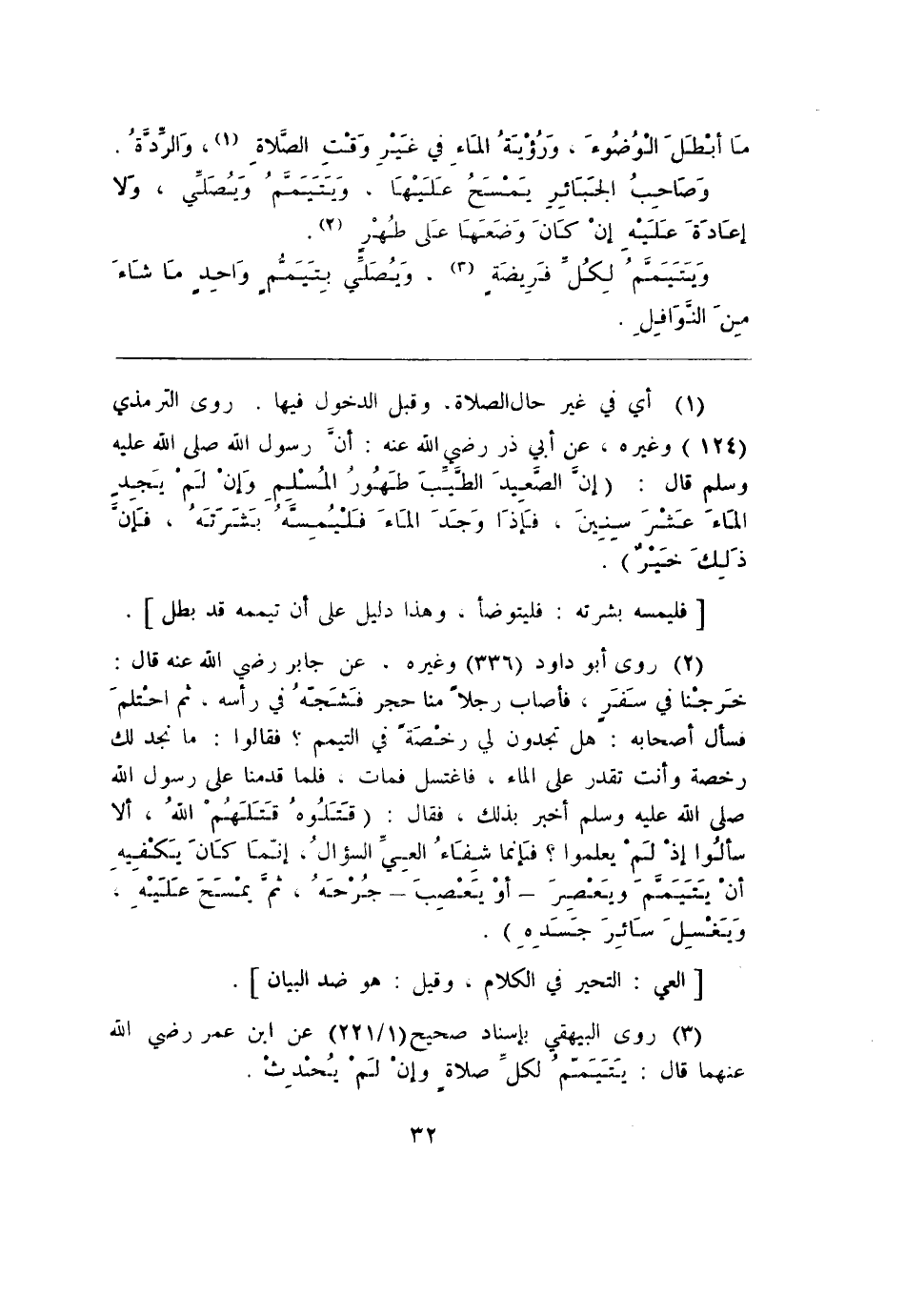 (¬1) أي في غير حال الصلاة، وقبل الدخول فيها. روى الترمذي (124) وغيره، عن أيى ذر رضي الله عنه: أن رسول الله صلى الله عليه وسلم قال: (إن الصَعِيدَ الطَيبَ طَهُور المُسْلِمِ وَإن لم يَجِد المَاءَ عَشْر سنِينَ، فَإذَا وَجَدَ المَاءَ فَلْيُمِسهُ بشَرَتهُ، فَإن ذَلِك خَير).