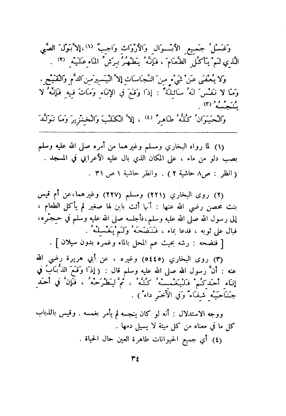 (¬1) لما رواه البخاري ومسلم وغيرهما من أمره صلى الله عليه وسلم بصب دلو من ماء، على المكان الذي بال عليه الأعرابي في المسجد.