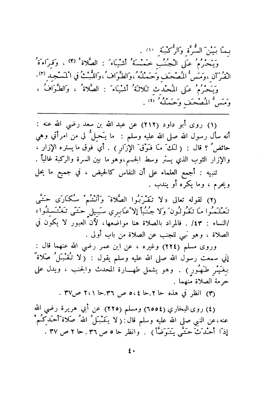 (¬4) روى البخاري (6554): مسلم (225) عن أبى هريرة رضي الله عنه، عن النبي صلى الله عليه وسلم قال: (لا يقبل اللهُ صَلاة أحَدكِمْ إذا أحدثَ حَتى يتوَضأ). وانظر حا 5 ص 36. حا 2 ص 37.