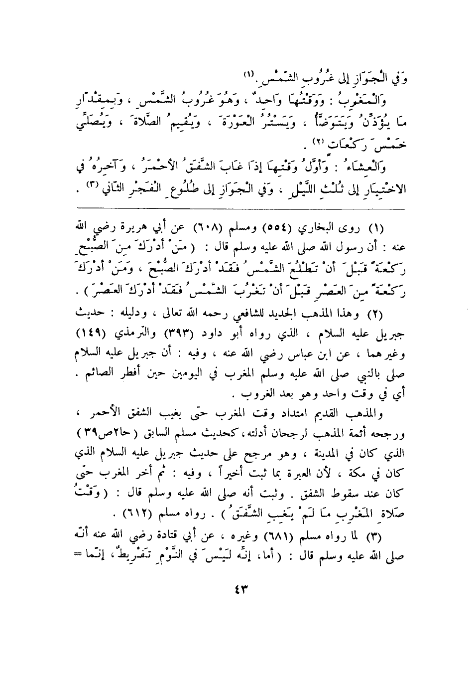 (¬2) وهذا المذهب الجديد للشافعي رحمه الله تعالى، ودليله: حديث جبريل عليه السلام، الذي رواه أبو داود (393) والترمذي (149) وغيرهما، عن ابن عباس رضي الله عنه، وفيه: أن جبريل عليه السلام صلى بالنبي صلى الله عليه وسلم المغرب في اليومين حين أفطر الصائم.