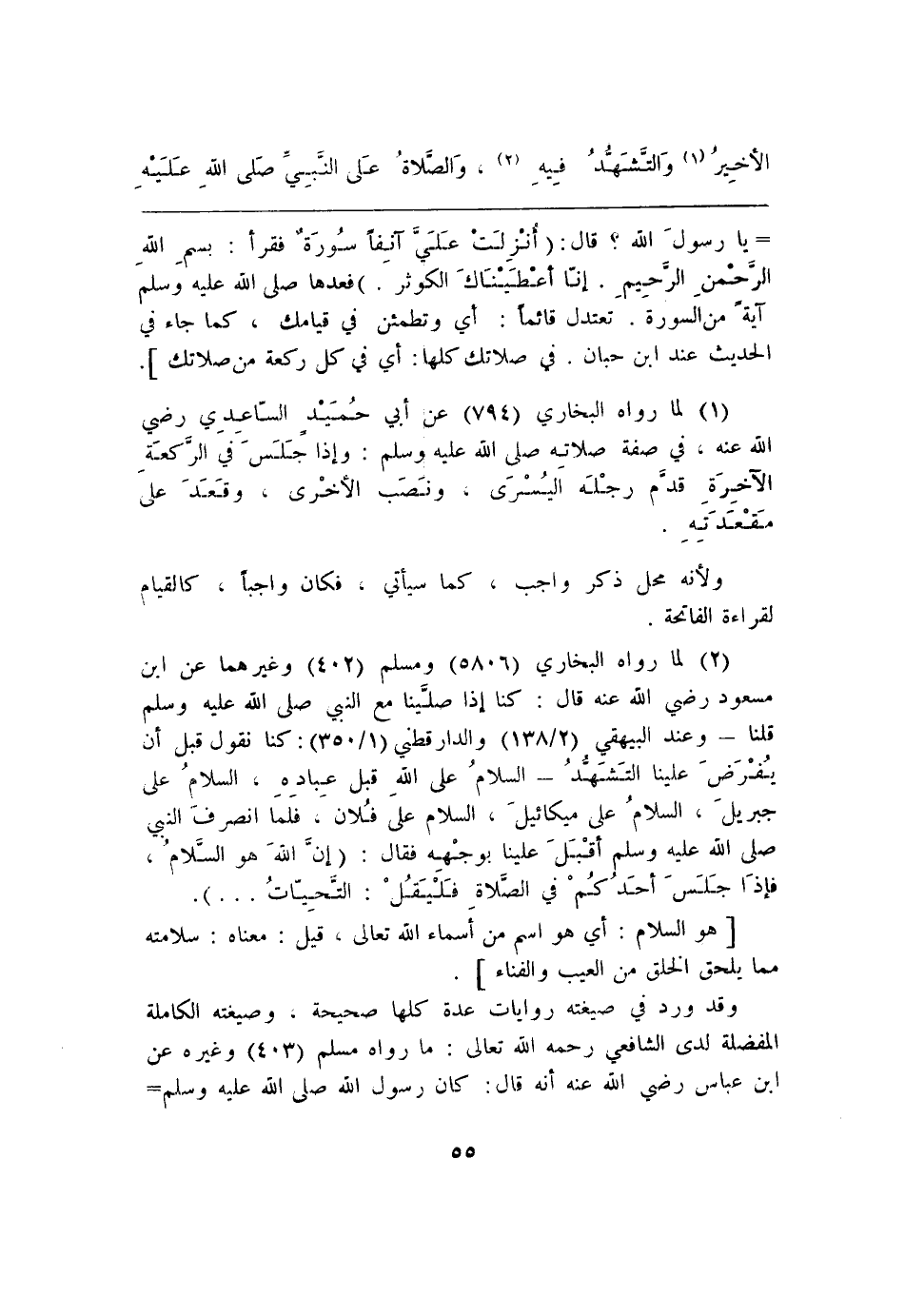 = يا رسول الله؟ قال: (أنْزِلَتْ علي آنِفاً سورة فقرأ: بسمِ الله الرحْمنِ الرحيمِ. إنا أعْطَيْنَاكَ الكوثر.) فعدها صلى الله عليه وسلمَ آية من السورة. تعتدل قائمة: أي وتطمئن في قيامك، كما جاء في الحديث عن ابن جان. في صلاتك كلها: أي في كل ركعة من صلاتكُ].