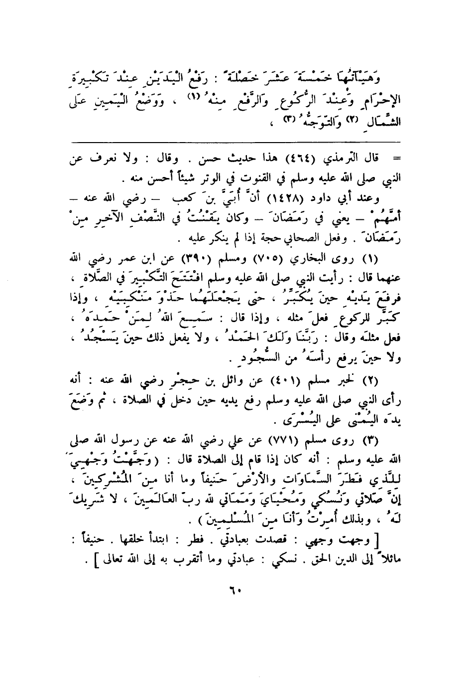 (¬3) روى مسلم (771) عن علي رضي الله عنه عن رسول الله صلى الله عليه وسلم: أنه كان إذا قام إلى الصلاة قال: (وَجَهْتُ وَجْهِيَ لِلذِي فَطَرَ السمَاوَاتِ والأرْضَ حنيفاً وما أنا مِنَ المُشْركِينَ، إن صَلاتي وَنُسُكي وَمُحْيَايَ وَمَماتي لله رب العَالمَينَ، لا شَرِيك لَهُ، وبذلك أمِرت وَأنَا مِنَ المسلمِينَ).