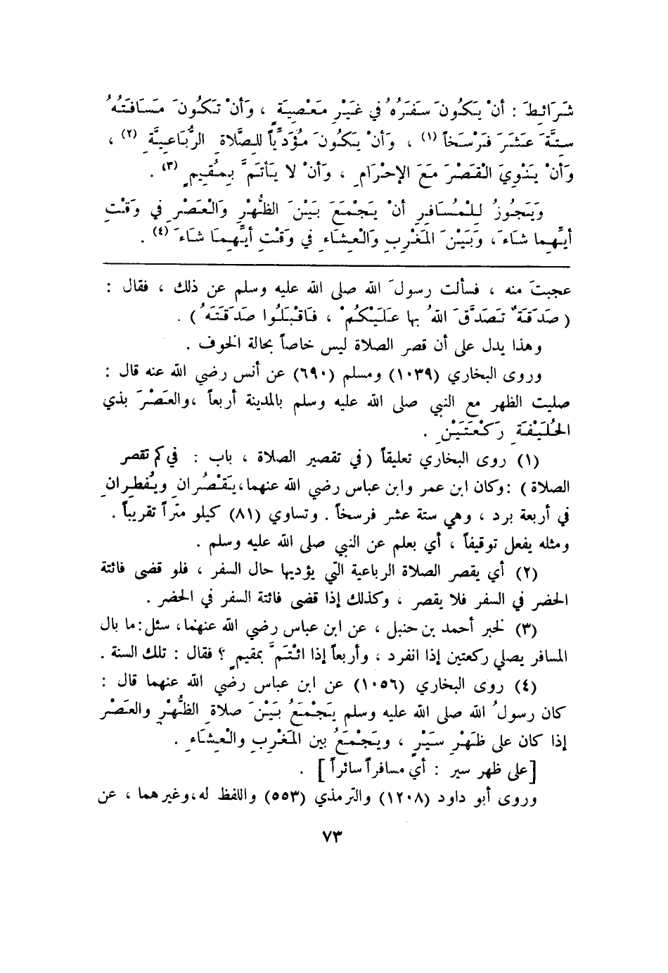 (¬1) َ روى البخاري تعليقا (في تقصير الصلاة، باب: في كم تقصر الصلاة): وكان ابن عمر وابن عباس رضي الله عنهما، يَقْصُران ويفطران في أربعة برد، وهي ستة عشر فرسخاً. وتساوي (81) كيلو متراً تقريباً.