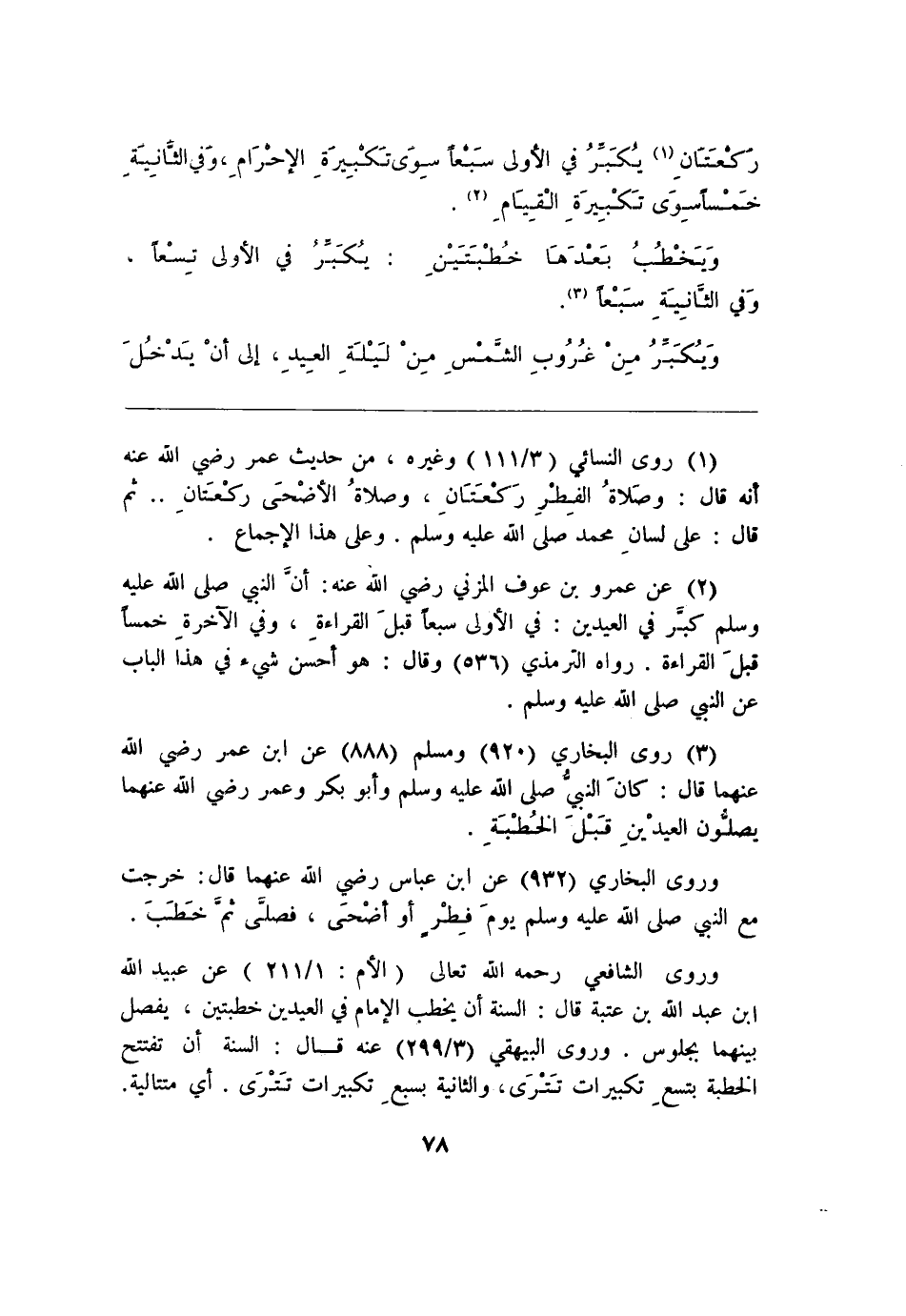 (¬1) روى النسائي (3/ 111) وغيره، من حديث عمر رضي الله عنه أنه قال: وصلاةُ الفِطْرِ رَكْعَتَانِ، وصلاةُ الأضْحى ركْعَتانِ .. ثم قال: على لسانِ محمد صلى الله عليه وسلم. وعلى هذا الإجماع.