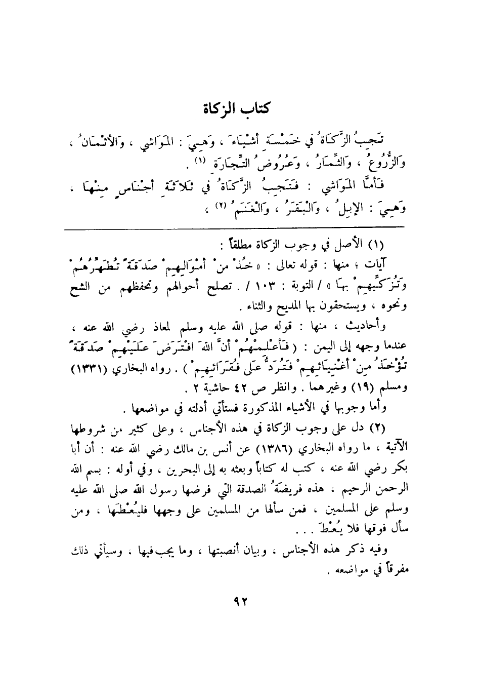 وأحاديث، منها: قوله صلى الله عليه وسلم لمعاذ رضى الله عنه، عندما وجهه إلى اليمن: (فَأعْلِمْهُمْ أن اللهَ أفترض عَلَيهمْ صَدَقَة تُؤْخَذُ مِنْ أغْنِيَائهِمْ فَتُرَد عَلى فُقَرَائِهم). رواه البخارى (1331) ومسلم (19) وغيرهما. وانظر ص 42 حاشية 2.