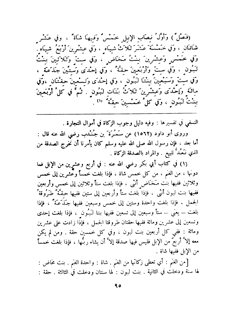 [من الغنم: أي تعطى زكاتها من الغنم. شاة: واحدة الغنم. بنت مخاض: لها سنة ودخلت في الثانية. بنت لبون: لها سنتان ودخلت في الثالثة. حقة: