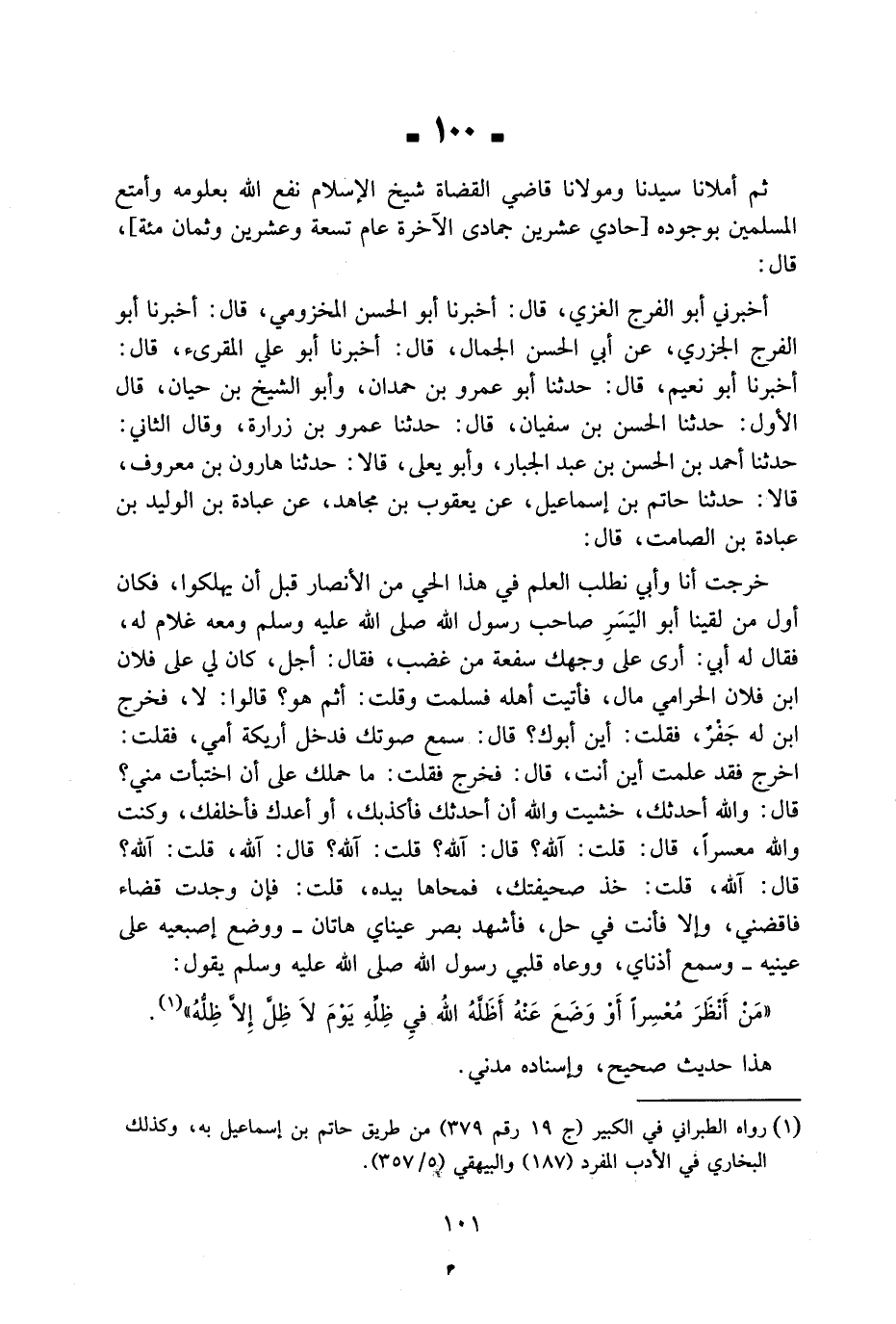 خَرَجْتُ أَنَا وَأَبِي نَطْلُبُ الْعِلْمَ فِي هَذَا الْحَيِّ مِنَ الْأَنْصَارِ قَبْلِ أَنْ يَهْلَكوا فَكَانَ أَوَّلُ مَنْ لَقِيَّنَا أَبُو الْيَسَرِ صَاحِبِ رَسُولِ اللَّهِ صَلَّى اللَّهُ عَلَيْهِ وَسَلَّمَ وَمَعَهُ غُلَامٍ لَهُ فَقَالَ لَهُ أَبِي أَرَى عَلَى وَجْهِكَ سَفْعَةً مِنْ غَضَبٍ فَقَالَ أَجَلْ كَانَ لِي عَلَى فُلَانِ ابْن فُلَانٍ الْحَرَامِيِّ مَالٌ فَأَتَيْتُ أَهْلَهُ فَسَلَّمْتُ وَقُلْتُ أَثَمَّ هُوَ قَالُوا لَا فَخَرَجَ ابْنٌ لَهُ جَفْرٌ فَقُلْتُ أَيْنَ أَبُوكَ قَالَ سَمِعَ صَوْتَكَ فَدَخَلَ أَرِيكَةَ أُمِّي فَقُلْتُ اخْرُجْ فَقَدْ عَلِمْتُ أَيْنَ أَنْتَ قَالَ فَخَرَجَ فَقُلْتُ مَا حَمَلَكَ عَلَى أَنِ اخْتَبَأْتَ مِنِي قَالَ وَاللَّهِ أُحَدِّثُكَ خَشِيتُ وَاللَّهِ أَنْ أُحَدِّثَكَ فَأُكْذِبَكَ أَوْ أَعِدَكَ فَأُخْلِفَكَ وَكُنْتُ وَاللَّهِ مُعْسِرًا قَالَ قُلْتُ آللَّهُ قَالَ آللَّهُ قُلْتُ آللَّهُ قَالَ آللَّهُ قُلْتُ آللَّهُ قَالَ الله قلت خُذ صحيفتك فمحاها بِيَدِهِ قُلْتُ فَإِنْ وَجَدْتَ قَضَاءً فَاقْضِنِي وَإِلَّا فَأَنْتَ فِي حِلٍ فَأَشْهَدُ بَصُرَ عَيْنَاي هَاتَانِ وَوَضَعَ إِصْبَعَيْهِ عَلَى عَيْنَيْهِ وَسَمِعَ أُذُنَاي وَوَعَاهُ قَلْبِي رَسُولُ اللَّهِ صَلَّى اللَّهُ عَلَيْهِ وَسَلَّمَ يَقُولُ مَنْ أَنْظَرَ مُعْسِرًا أَوْ وَضَعَ عَنْهُ أظلهُ الله فِي ظله يزم لَا ظِلَّ إِلَّا ظِلُّهُ