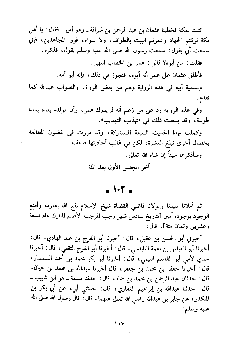 102 - ثمَّ أملانا سيدنَا ومولانا قَاضِي الْقُضَاة شيخ الْإِسْلَام نفع الله بِعُلُومِهِ وأمتع الْوُجُود بِوُجُودِهِ آمين بتاريخ سادس شهر رَجَب المرجب الْأَصَم الْمُبَارك عَام تِسْعَة وَعشْرين وثمان مئة قَالَ