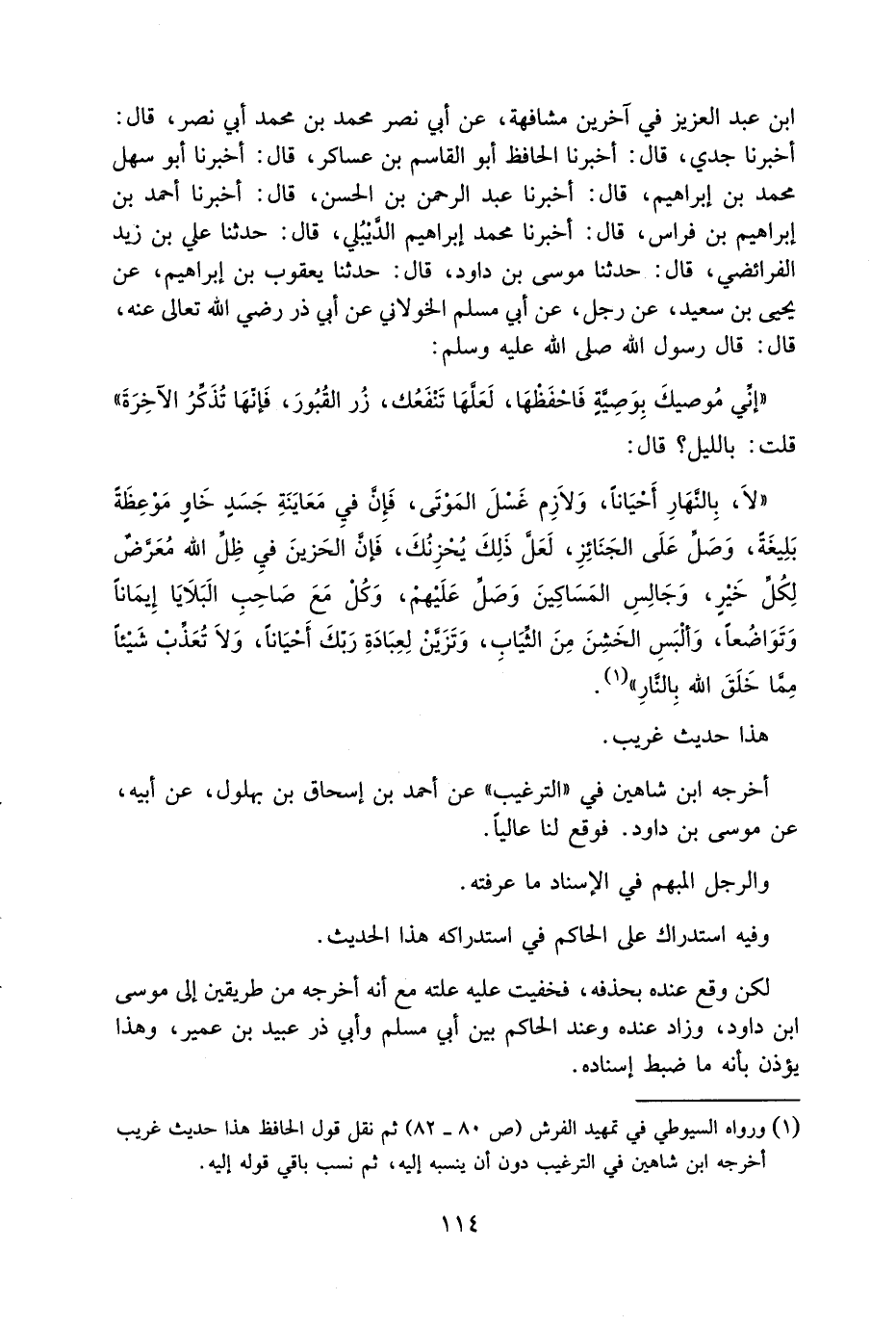 ابْن عَبْدِ الْعَزِيزِ فِي آخَرِينَ مُشَافَهَةً عَنْ أَبِي نَصْرٍ مُحَمَّدِ بْنِ مجمد أَبِي نَصْرٍ قَالَ أَخْبَرَنَا جَدِّي قَالَ أَخْبَرَنَا الْحَافِظُ أَبُو الْقَاسِمِ بْنُ عَسَاكِرٍ قَالَ أَخْبَرَنَا أَبُو سَهْلٍ مُحَمَّدُ بْنُ إِبْرَاهِيمَ قَالَ أَخْبَرَنَا عَبْدُ الرَّحْمَنِ بْنُ الْحَسَنِ قَالَ أَخْبَرَنَا أَحْمَدُ بْنُ إِبْرَاهِيمَ بْنِ فُرَاسٍ قَالَ أَخْبَرَنَا مُحَمَّدُ إِبْرَاهِيم الديبلي قَالَ حَدَّثَنَا عَلِيُّ بْنُ زَيْدٍ الْفَرَائِضِيُّ قَالَ حَدَّثَنَا مُوسَى بْنُ دَاوُد قَالَ حَدَّثَنَا يَعْقُوبُ بْنُ إِبْرَاهِيمَ عَنْ يَحْيَى بْنِ سَعِيدٍ عَنْ رَجُلٍ عَنْ أَبِي مُسْلِمٍ الْخَوْلَانِيِّ عَنْ أَبِي ذِرٍ رَضِيَ اللَّهُ تَعَالَى عَنْهُ قَالَ قَالَ رَسُولُ اللَّهِ صَلَّى اللَّهُ عَلَيْهِ وَسَلَّمَ إِنِّي مُوصِيكَ بِوَصِيَّةٍ فَاحْفَظْهَا لَعَلَّهَا تَنْفَعُكَ زُرِ الْقُبُورَ فَإِنَّهَا تُذَكِّرُ الْآخِرَةَ