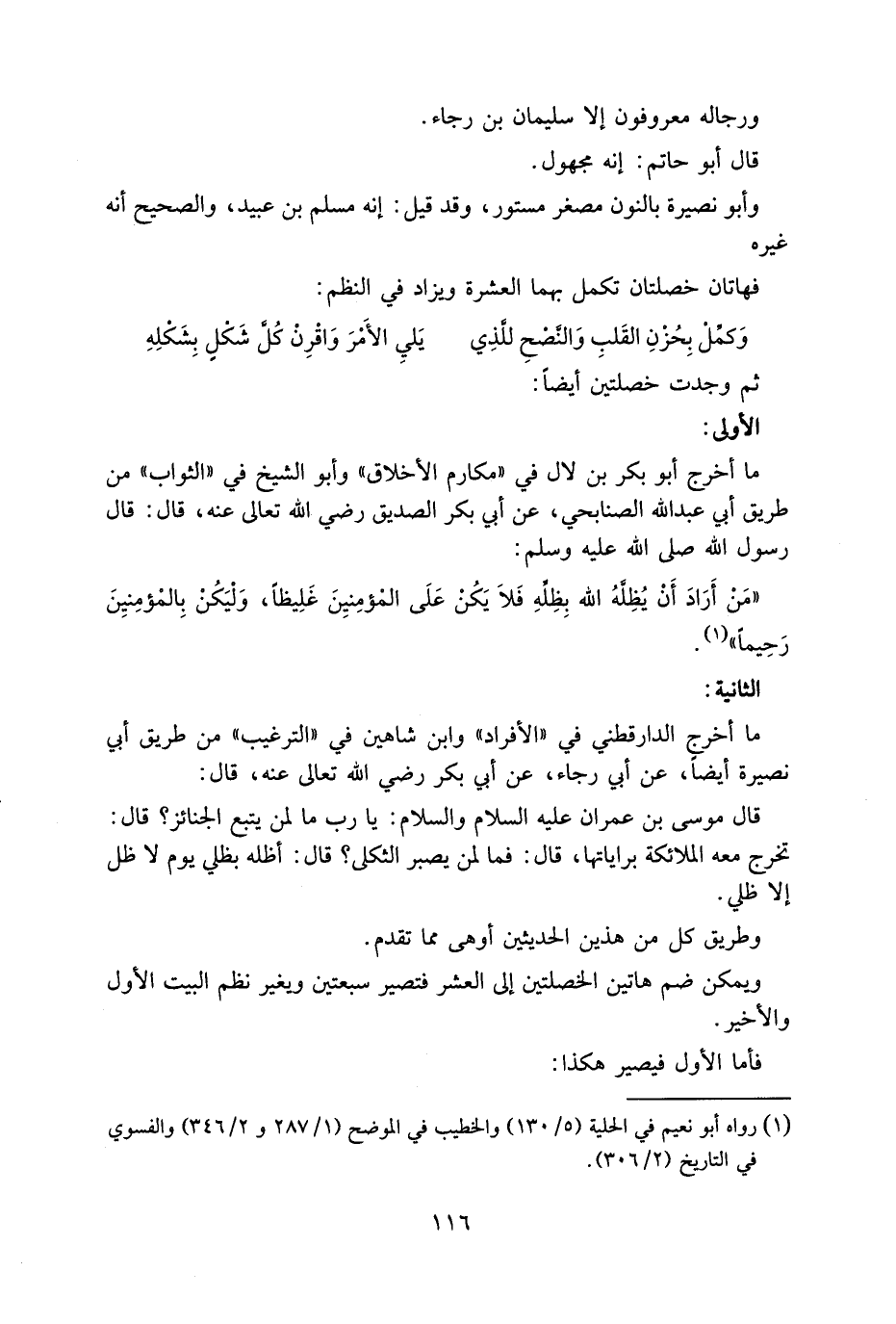 الْأُوْلَى مَا أَخْرَجَ أَبُو بَكْرِ بْنُ لَالٍ فِي مَكَارِمِ الْأَخْلَاقِ وَأَبُو الشَّيْخِ فِي الثَّوَابِ مِنْ طَرِيقِ أَبِي عَبْدِ اللَّهِ الصُّنَابِحِيِّ عَنْ أَبِي بَكْرٍ الصَّدِيقِ رَضِيَ اللَّهُ تَعَالَى عَنْهُ قَالَ قَالَ رَسُولُ اللَّهِ صَلَّى اللَّهُ عَلَيْهِ وَسَلَّمَ مَنْ أَرَادَ أَنْ يُظِلَّهُ اللَّهُ بِظِلِّهِ فَلَا يَكُنْ عَلَى الْمُؤْمِنيِنَ غَلِيظًا وَلْيَكُنْ بِالْمُؤْمِنيِنَ رَحِيمًا