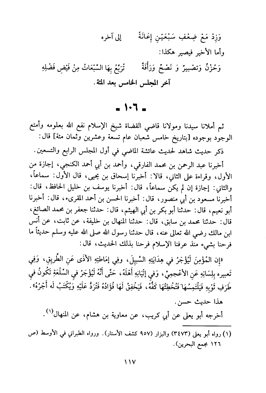 106 - ثمَّ أملانا سيدنَا ومولانا قَاضِي الْقُضَاة شيخ الْإِسْلَام نفع الله بِعُلُومِهِ وأمتع الْوُجُود بِوُجُودِهِ بتاريخ خَامِس شعْبَان عَام تِسْعَة وَعشْرين وثمان مئة قَالَ ذكر حَدِيث شَاهد لحَدِيث عَائِشَة الْمَاضِي فِي أول الْمجْلس الرَّابِع وَالتسْعين أَخْبَرَنَا عَبْدُ الرَّحْمَنِ بْنُ مُحَمَّدٍ الْفَارِقِيُّ وَأَحْمَدُ بْنُ أَبِي أَحْمَدَ الْكِنْجِي إِجَازَةً مِنَ الْأَوَّلِ وَقِرَاءَةً عَلَى الثَّانِي قَالَا أَخْبَرَنَا إِسْحَاقُ بْنُ يَحْيَى قَالَ الْأَوَّلُ سَمَاعًا وَالثَّانِي إِجَازَةً إِنْ لَمْ يَكُنْ سَمَاعًا قَالَ أَخْبَرَنَا يُوسُفُ بْنُ خَلِيلٍ الْحَافِظُ قَالَ أَخْبَرَنَا مَسْعُودُ بْنُ أَبِي مَنْصُورٍ قَالَ أَخْبَرَنَا الْحَسَنُ بْنُ أَحْمَدَ الْمُقْرِئ قَالَ أَخْبَرَنَا أَبُو نُعَيْمٍ قَالَ حَدَّثَنَا أَبُو بَكْرِ بْنُ أَبِي الْهَيْثَمِ قَالَ حَدَّثَنَا جَعْفَرُ بْنُ مُحَمَّدٍ الصَّائِغُ قَالَ حَدَّثَنَا مُحَمَّدُ بْنُ سَابِقٍ قَالَ حَدَّثَنَا الْمِنْهَالُ بْنُ خَلِيفَةَ عَنْ ثَابِتٍ عَنْ أنس ابْن مَالِكٍ رَضِيَ اللَّهُ تَعَالَى عَنْهُ قَالَ حَدَّثَنَا رَسُولُ اللَّهِ صَلَّى اللَّهُ عَلَيْهِ وَسَلَّمَ حَدِيثًا مَا فَرِحْنَا بِشَيْءٍ مُنْذُ عَرِفْنَا الْإِسْلَامَ فَرِحْنَا بِذَلِكَ الْحَدِيثِ قَالَ إِنَ الْمُؤْمِنَ لَيُؤْجَرُ فِي هِدَايَتِهِ السَّبِيلَ وفِي إِمَاطتِهِ الْأَذَى عَنِ الطَّريِقِ وَفِي تَعْبِيرِهِ بِلِسَانِهِ عَنِ الْأَعْجَمِيِّ وفِي إِتْيَانِهِ أَهْلَهُ حَتَّى أَنَّهُ ليؤجر فِي السّلْعَة يكون فِي طَرَفِ ثَوْبِهِ فَيَلْتَمِسُهَا فَتُخْطِئُهَا كَفُّهُ فَيَخْفِقُ لَهَا فُؤْادُهُ فَتُرَدُّ عَلَيْهِ وَيُكْتَبُ لَهُ أَجْرُهُ