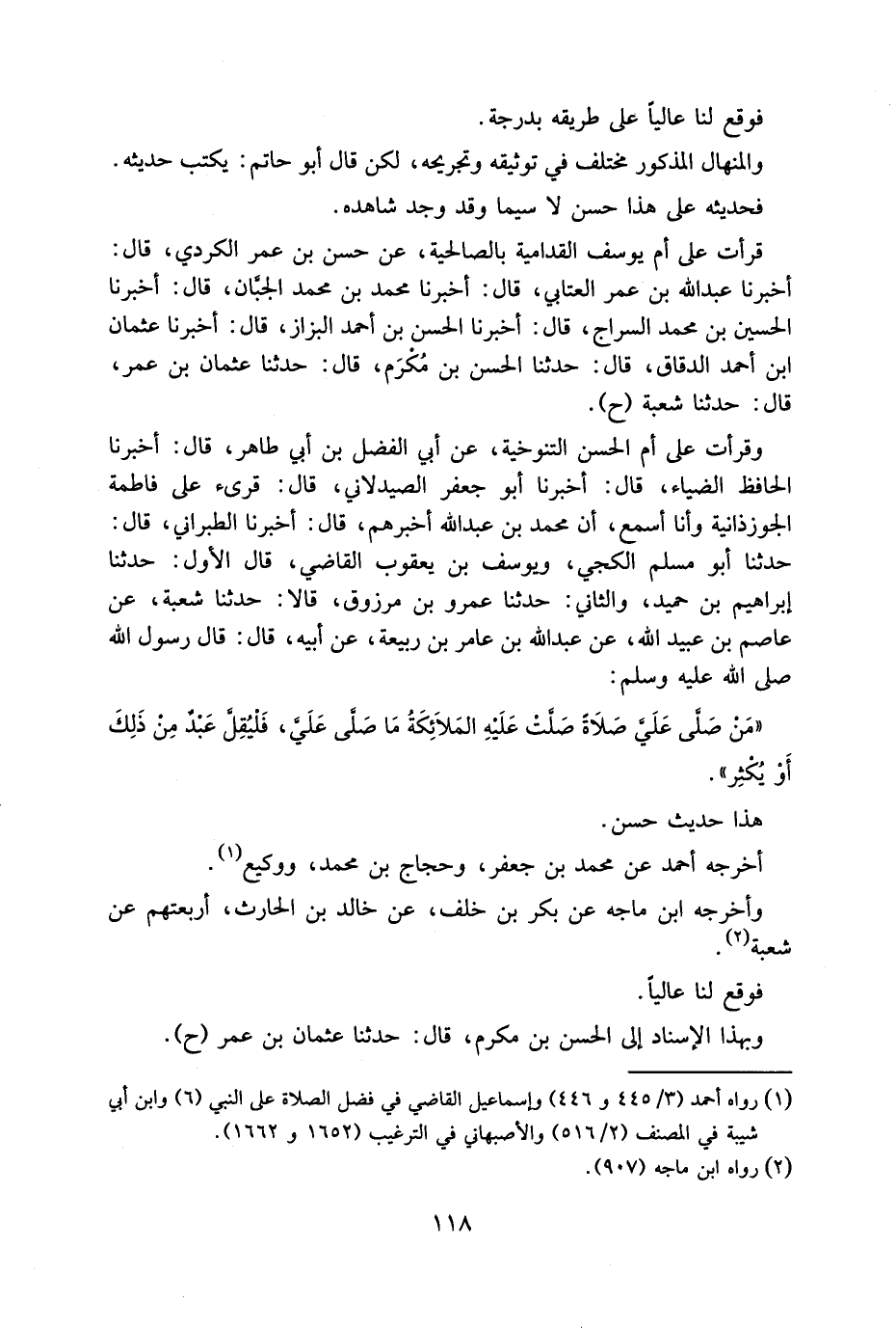 وَقَرَأْتُ عَلَى أُمِّ الْحَسَنِ التَّنُوخِيَّةِ عَنْ أَبِي الْفَضْلِ بْنِ أَبِي طَاهِرٍ قَالَ أَخْبَرَنَا الْحَافِظُ الضِّيِاءُ قَالَ أَخْبَرَنَا أَبُو جَعْفَرٍ الصيدلاني قَالَ قريء عَلَى فَاطِمَةَ الْجُوْزِذَانِيَّةِ وَأَنَا أَسْمَعُ أَنَّ مُحَمَّدَ بْنَ عَبْدِ اللَّهِ أَخْبَرَهُمْ قَالَ أَخْبَرَنَا الطَّبَرَانِيُّ قَالَ حَدثنَا أَبُو مُسلم الْكَجِّي وَيُوسُفُ بْنُ يَعْقُوبَ الْقَاضِي قَالَ الْأَوَّلُ حَدَّثَنَا إِبْرَاهِيمُ بْنُ حُمَيْدٍ وَالثَّانِي حَدَّثَنَا عَمْرُو بْنُ مَرْزُوقٍ قَالَا حَدَّثَنَا شُعْبَةُ عَنْ عَاصِمِ بْنِ عُبَيْدِ اللَّهِ عَنْ عَبْدِ اللَّهِ بْنِ عَامِرِ بْنِ رَبِيعَةَ عَنْ أَبِيهِ قَالَ قَالَ رَسُولُ اللَّهِ صَلَّى اللَّهُ عَلَيْهِ وَسَلَّمَ مَنْ صَلَّى عَلَيَّ صَلَاةً صَلَّتْ عَلَيْهِ الْمَلَائِكَة ُمَا صَلَّى عَلَيَّ فَلْيقل عِنْد مِنْ ذَلِكَ أَوْ يُكْثِرُ